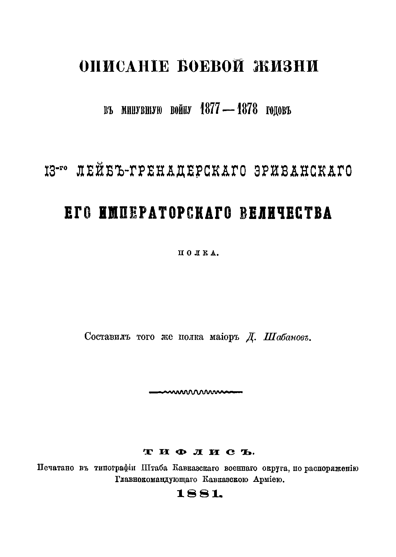 Описанiе боевой жизни въ минувшую войну 1877-1878 годовъ 13-го лейб-гренадерскаго Эриванскаго Его Императорскаго Величества полка