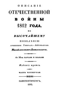 «Описание Отечественной войны» создано им в 1834—40 годах по Высочайшему повелению императора Николая I, когда он занимал должность сенатора и начальника военно-цензурного комитета. Это масштабное сочинение стало первой русской официальной историей 1812 г.