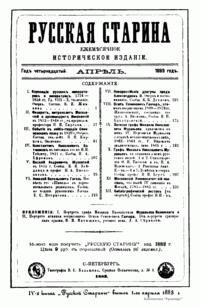 «Русская старина», ежемесячный исторический журнал, выходил в Петербурге в 1870-1918. Основан, издавался и редактировался (1870-1892) М. И. Семевским при участии В. И. Семевского. Последующими редакторами были Н. К. Шильдер (1892-1896), Н. Ф. Дубровин (1896-1904), военные историки С. П. Зыков, П. Н. Воронов.