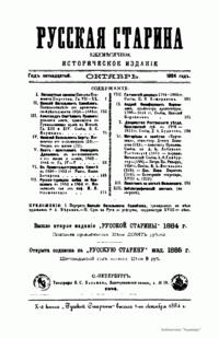 «Русская старина», ежемесячный исторический журнал, выходил в Петербурге в 1870-1918. Основан, издавался и редактировался (1870-1892) М. И. Семевским при участии В. И. Семевского. Последующими редакторами были Н. К. Шильдер (1892-1896), Н. Ф. Дубровин (1896-1904), военные историки С. П. Зыков, П. Н. Воронов.