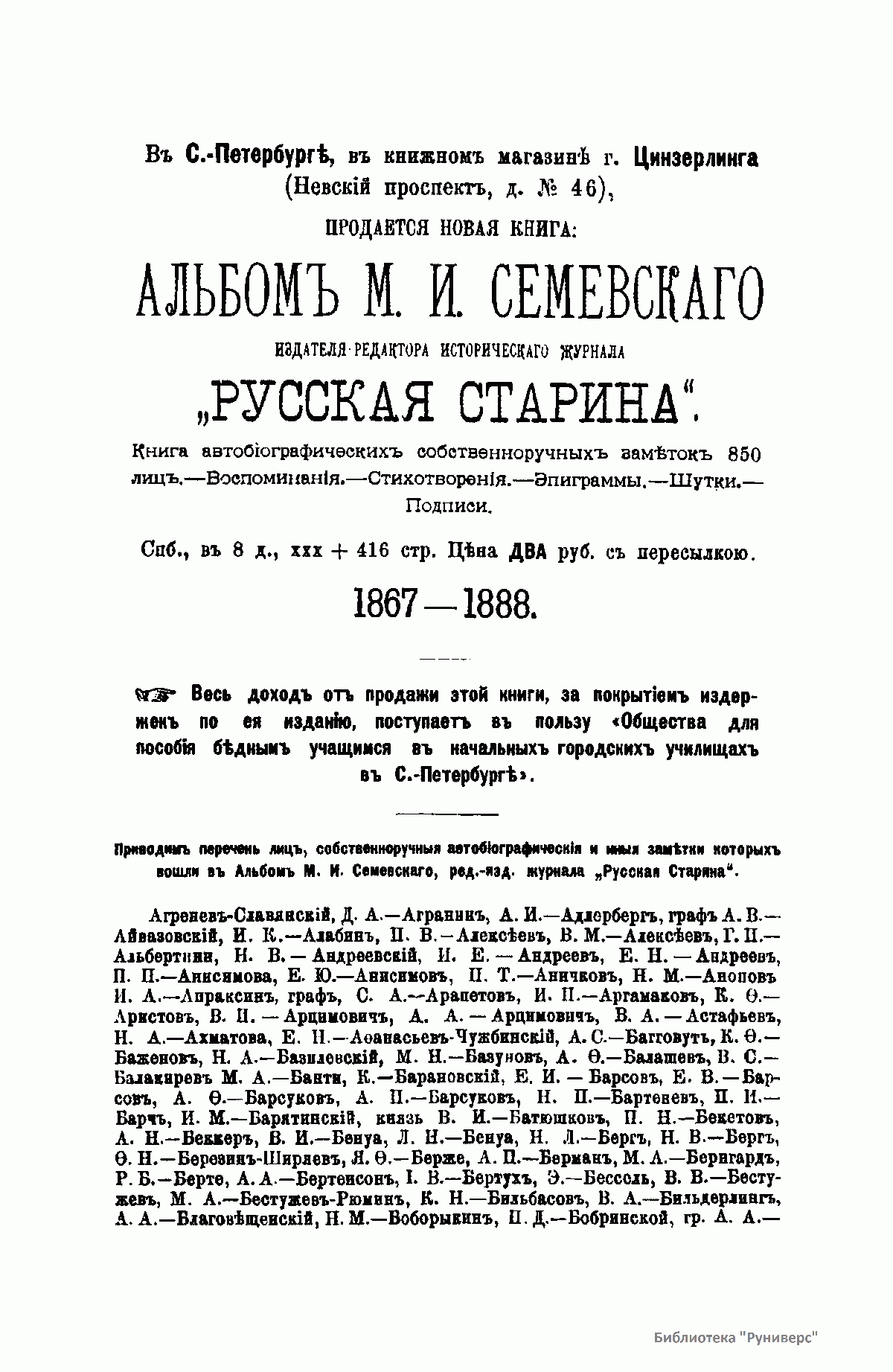 На страницах «Русской старины» напечатаны думы, послания, эпиграммы К. Ф. Рылеева, басни И. А. Крылова, И. И. Хемницера, Измайлова, стихотворения графа А. К. Толстого, К. Р., Я. Б. Княжнина, А. Н. Нахимова, К. П. Батюшкова, барона Дельвига, Розенгейма, В. А. Жуковского, М. Ю. Лермонтова, А. И. Одоевского, Кюхельбекера, Баратынского, вновь найденные строфы из «Евгения Онегина» и отрывки из «Мертвых душ», а также автобиографии и переписки писателей, под редакцией П. А. Ефремова. Статьи и исследования по вопросам новейшей русской истории принадлежат самому М. И. Семевскому, В. А. Бильбасову, А. П. Брикнеру, князю Н. С. Голицыну, Д. И. Иловайскому, П. И. Карцову, барону Н. А. Корфу, Н. И. Костомарову, И. И. Ореусу, А. Н. Петрову, В. И. Семевскому, Н. К. Шильдеру и др.К журналу выпущены отдельные издания: Указатель «Русская старина».СПб, 1883 г . (1 том), «Систематическая роспись содержания «Русской старины» за 1870-1884 гг.» (СПб., 1885), и четыре прибавления: за 1885-1887 гг. (СПб., 1888), за 1888-1890 гг. (СПб., 1891), за 1891-1896 гг. (СПб., 1897), за 1896-1902 гг. (СПб., 1903) (5 изданий в 3-х томах), сборник гравюр «Русские деятели в портретах изданных редакциею исторического журнала «Русская старина». СПб, 1886-1891 гг.(5 изданий, 2 тома).