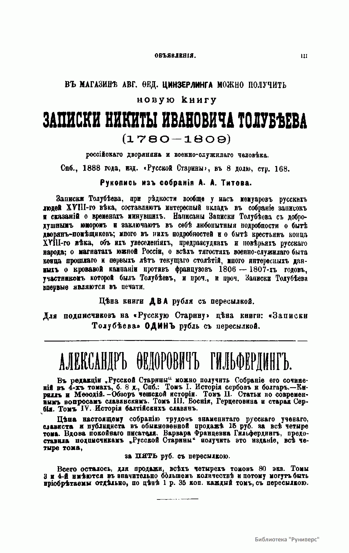 Крупным вкладом в журнал явились записки и дневник А. В. Никитенко (1888-1892), а также записки Н. И. Пирогова (1884-1885, 1887).
