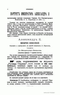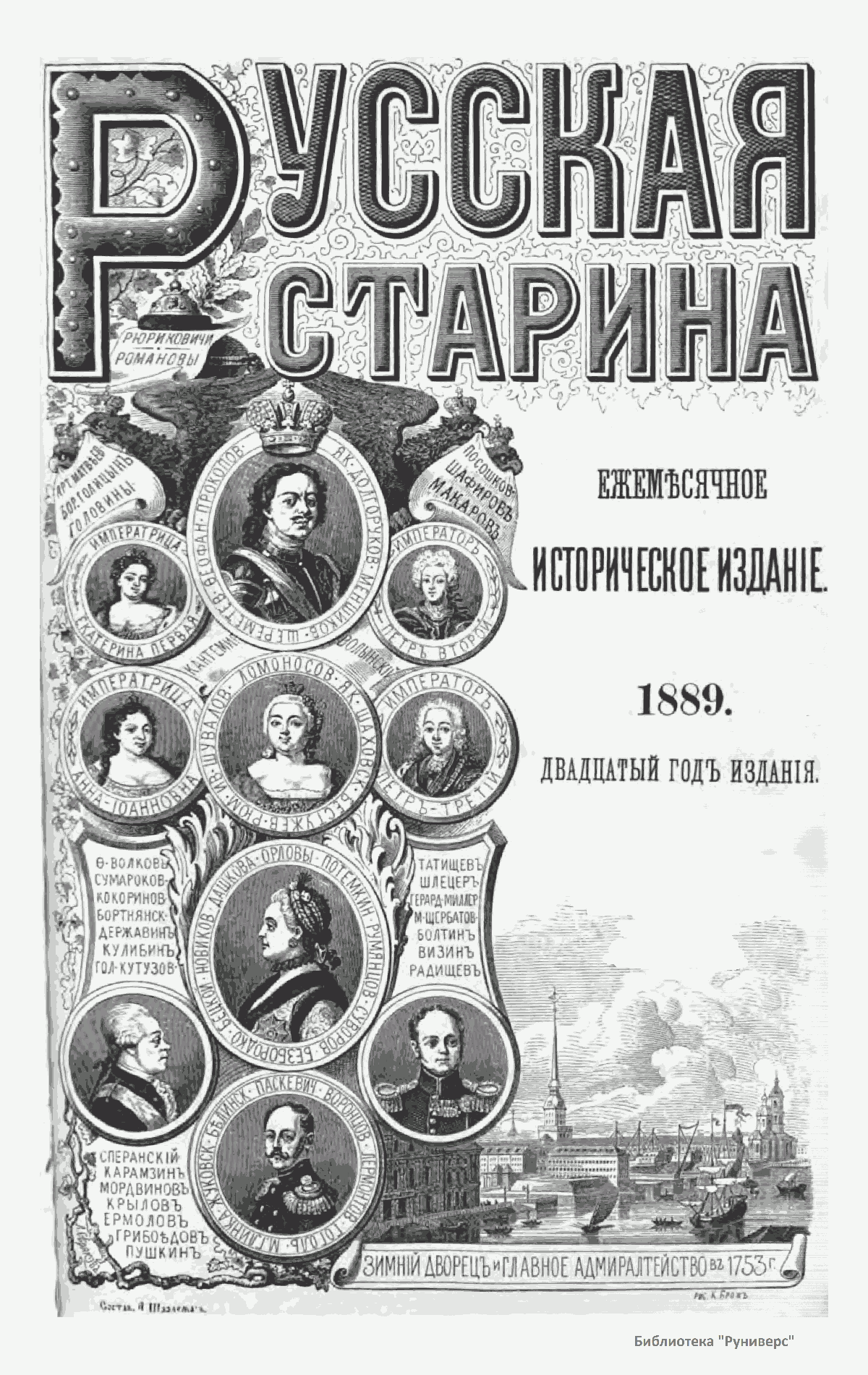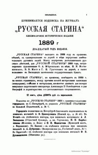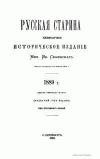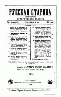 «Русская старина», ежемесячный исторический журнал, выходил в Петербурге в 1870-1918. Основан, издавался и редактировался (1870-1892) М. И. Семевским при участии В. И. Семевского. Последующими редакторами были Н. К. Шильдер (1892-1896), Н. Ф. Дубровин (1896-1904), военные историки С. П. Зыков, П. Н. Воронов.