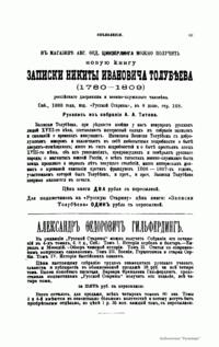 К истории искусства относятся записки М. И. Глинки (1870), воспоминания А. Г. Рубинштейна (1889) и известного архитектора А. Л. Витберга (1872), автобиографии И. П. Пожалостина (1881) и Л. А. Серякова (1875), записки И. К. Айвазовского (1878, 1881), Ф. И. Иордана (1891), Ф. Г. Солнцева (1876), воспоминания В. В. Самойлова (1875), П. А. Каратыгина (1872-1877, 1879), Л. Л. Леонидова (1886, 1888), записки Л. П. Никулиной-Косицкой (1878) и др.