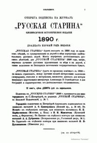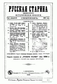 «Русская старина», ежемесячный исторический журнал, выходил в Петербурге в 1870-1918. Основан, издавался и редактировался (1870-1892) М. И. Семевским при участии В. И. Семевского. Последующими редакторами были Н. К. Шильдер (1892-1896), Н. Ф. Дубровин (1896-1904), военные историки С. П. Зыков, П. Н. Воронов.
