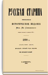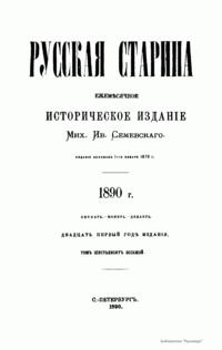 «Русская старина», ежемесячный исторический журнал, выходил в Петербурге в 1870-1918. Основан, издавался и редактировался (1870-1892) М. И. Семевским при участии В. И. Семевского. Последующими редакторами были Н. К. Шильдер (1892-1896), Н. Ф. Дубровин (1896-1904), военные историки С. П. Зыков, П. Н. Воронов.