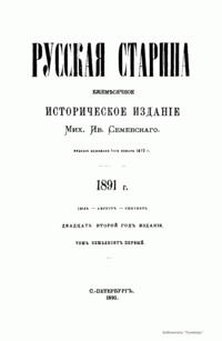 «Русская старина», ежемесячный исторический журнал, выходил в Петербурге в 1870-1918. Основан, издавался и редактировался (1870-1892) М. И. Семевским при участии В. И. Семевского. Последующими редакторами были Н. К. Шильдер (1892-1896), Н. Ф. Дубровин (1896-1904), военные историки С. П. Зыков, П. Н. Воронов.