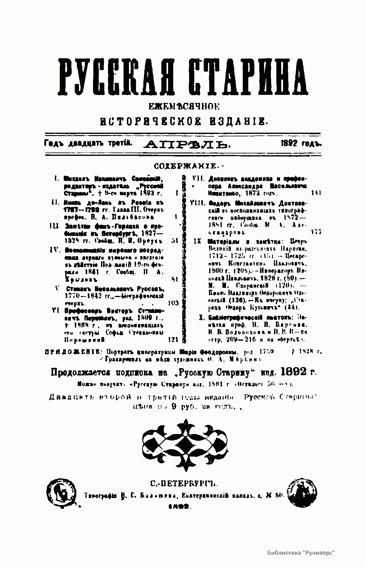 Русская cтарина. Том LXXIV. 1892. Выпуски 4-6