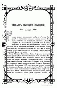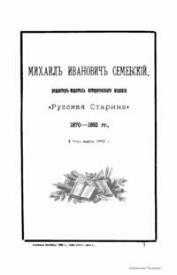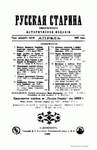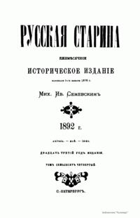 «Русская старина», ежемесячный исторический журнал, выходил в Петербурге в 1870-1918. Основан, издавался и редактировался (1870-1892) М. И. Семевским при участии В. И. Семевского. Последующими редакторами были Н. К. Шильдер (1892-1896), Н. Ф. Дубровин (1896-1904), военные историки С. П. Зыков, П. Н. Воронов.