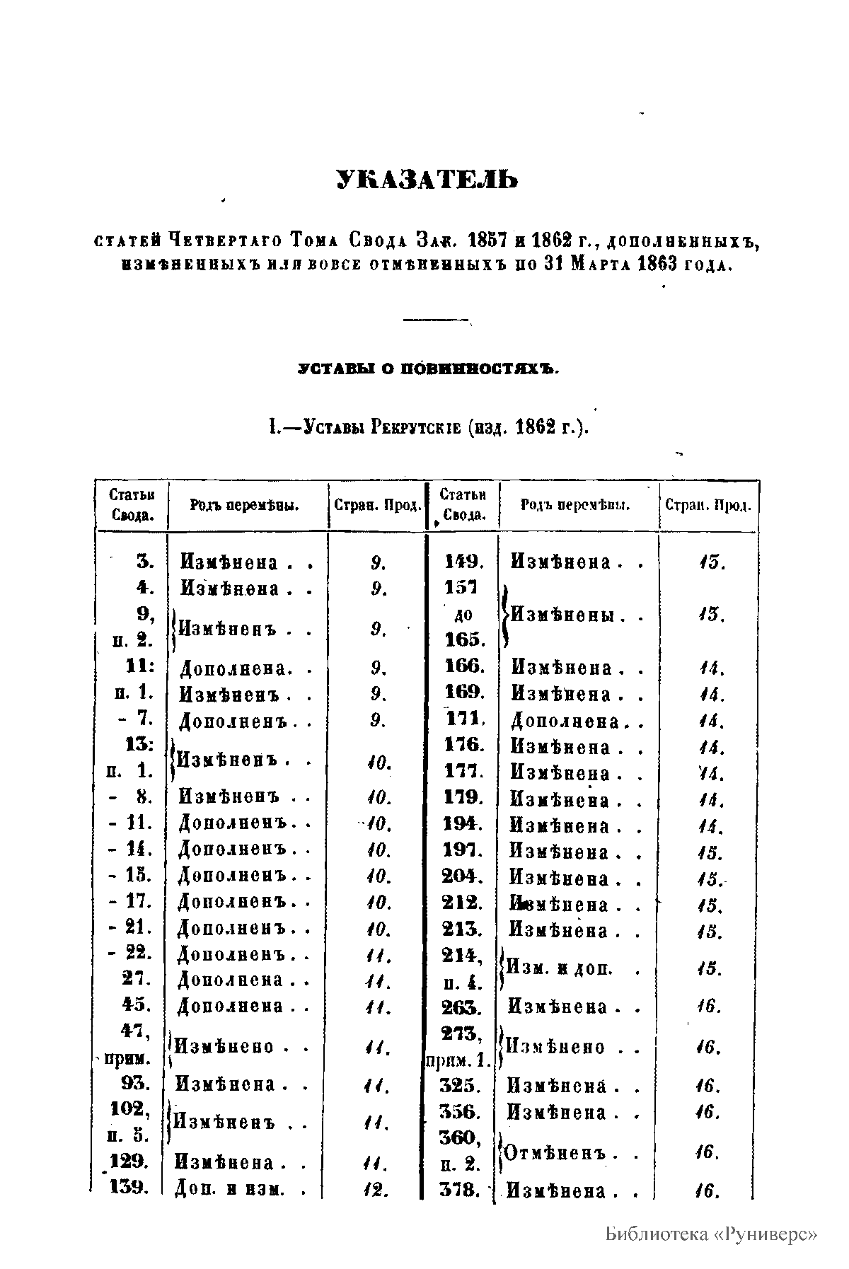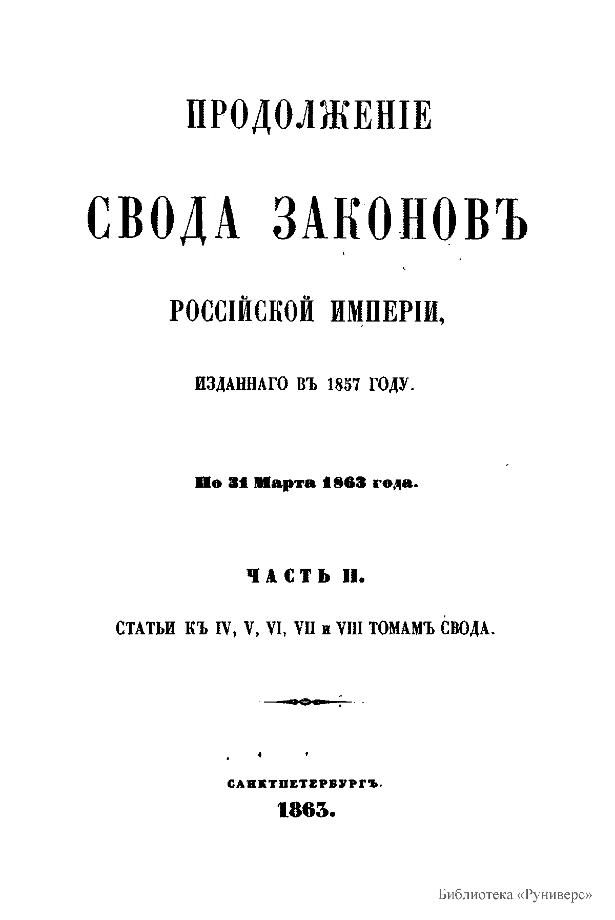 Продолжение свода законов Российской империи, изданного в 1857 году. По 31 мая 1863 года. Часть II. Статьи к IV, V, VII, VIII томам свода