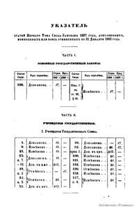 Свод законов Российской империи— официальное собрание расположенных в тематическом порядке действующих законодательных актов Российской империи, созданное при Николае I. Впервые он был напечатан в 1832 году. Манифестом 31 января 1833 года Свод законов был объявлен действующим источником права с 1 января 1835 года. Первое издание 1832 года и последующие 1842-го и 1857 года состояли из пятнадцати томов. После 1857 года Свод законов полностью не переиздавался, а выходили лишь отдельные тома. В качестве отдельного – 16-го тома в 1885 году вышли Судебные уставы. Между изданиями Свода законов выходили ежегодные и сводные (за несколько лет) «Продолжения» Свода законов с указанием на упраздненные и измененные статьи. В своде законов собраны все реально действовавшие в определенный момент времени законы по тем или иным проблемам права, это справочник для юристов. Отбор законодательного материала для включения в Свод производился на основе Полного собрания законов (первое Полное собрание законов, появившееся в 1830 году, состояло из 45 томов, содержащих 30 920 актов и 6 томов приложений). Собрание законов – это в большой степени историческое издание. По нему можно изучать развитие, направление правительственной мысли в стране. Это летопись отечественного законотворчества. Изучая страницу за страницей эту летопись, мы можем узнать, что в тот или иной момент истории являлось злобой дня.