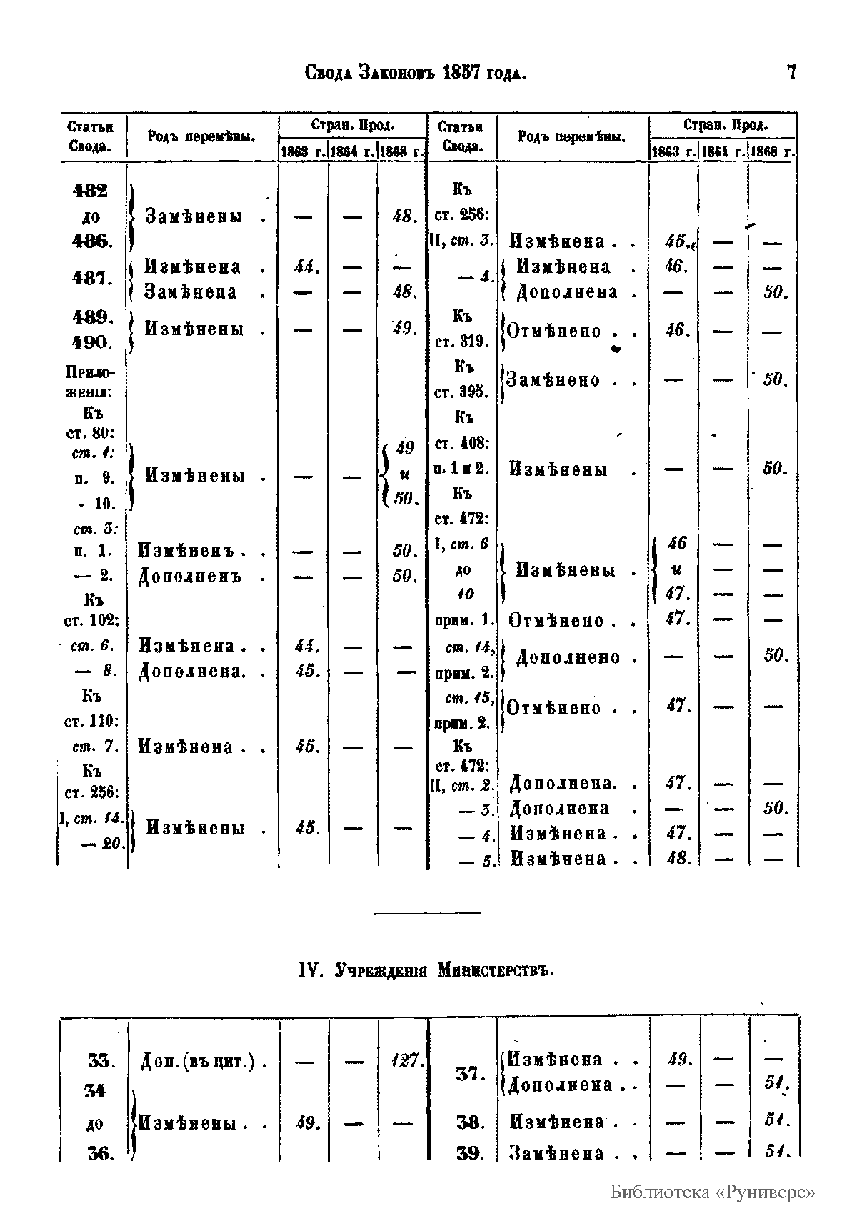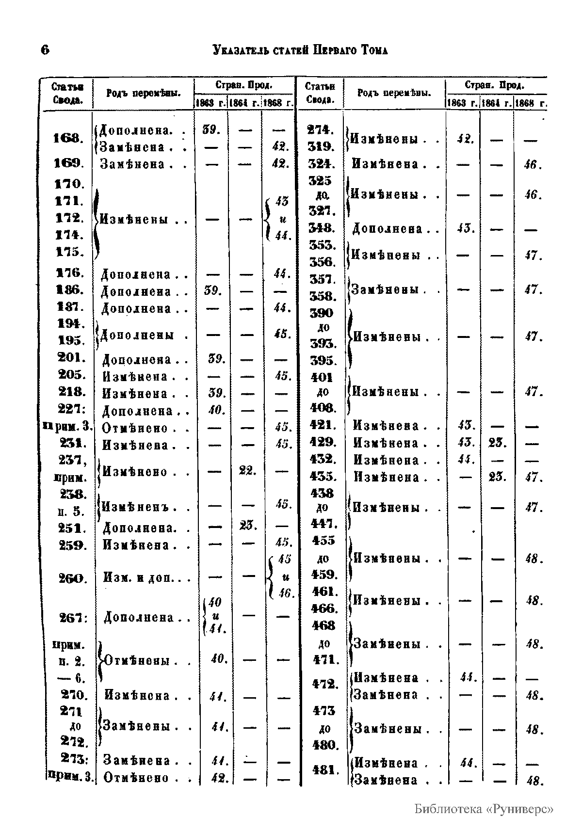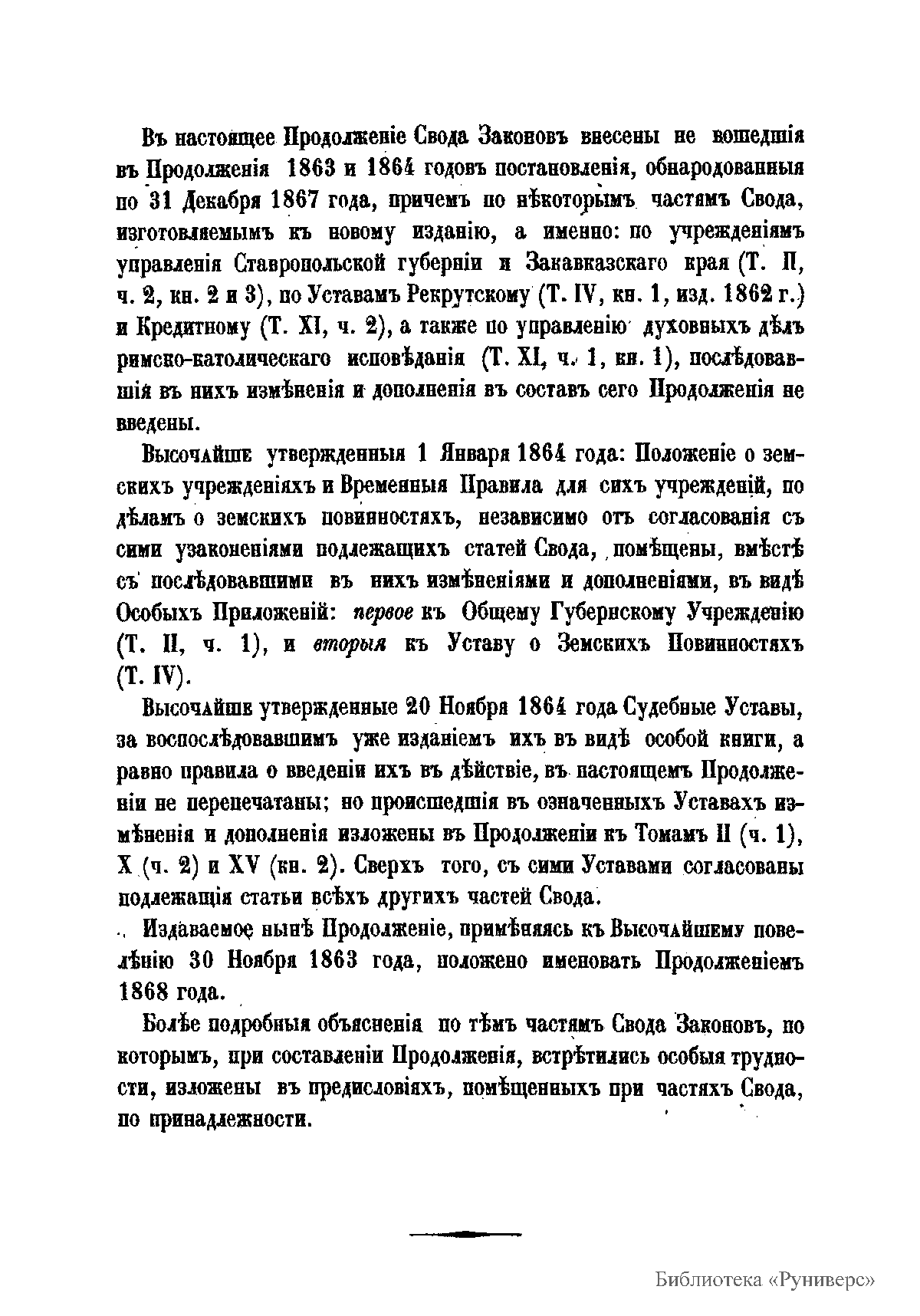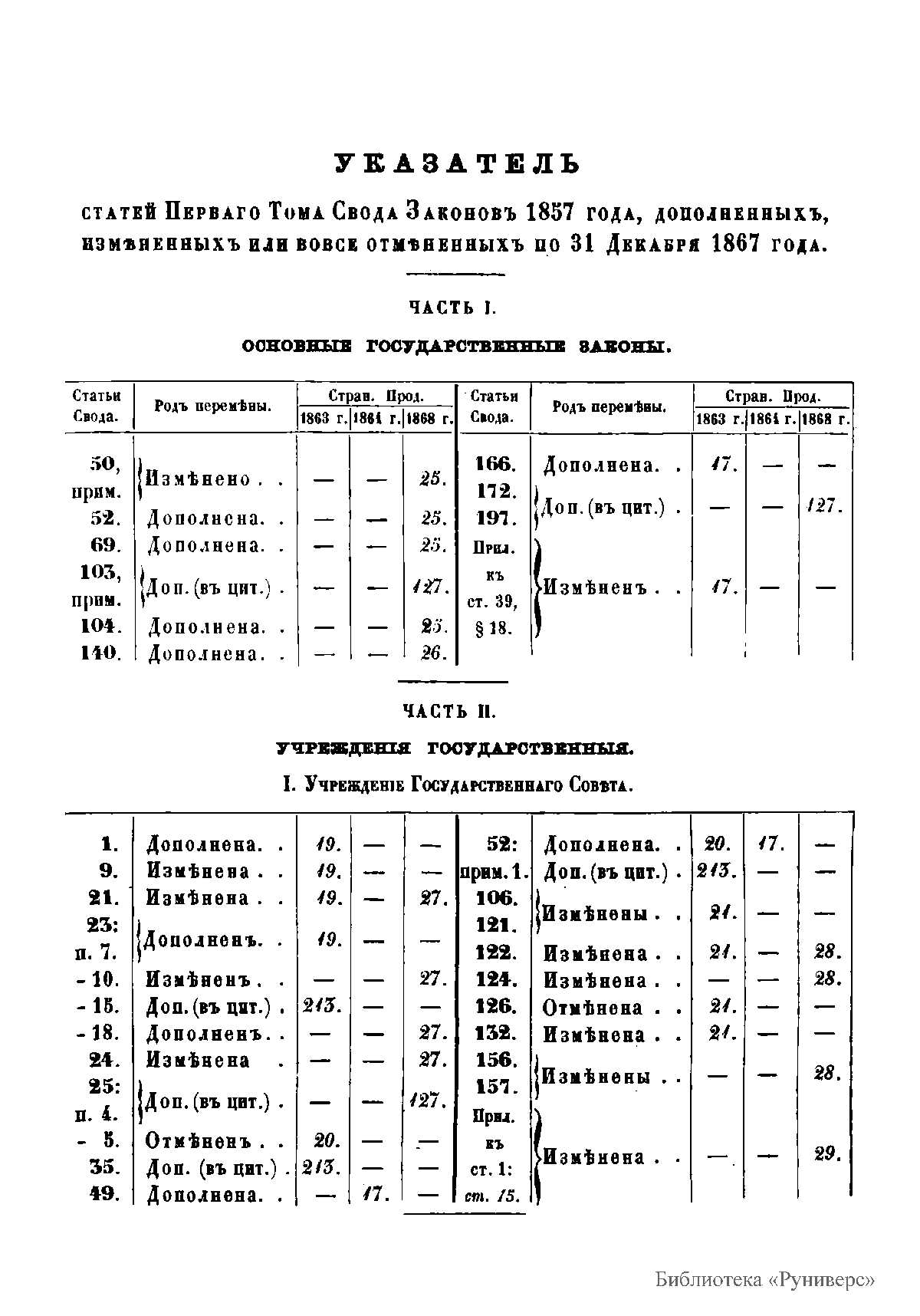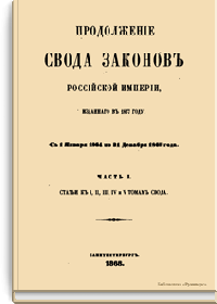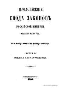 Продолжение свода законов Российской империи, изданного в 1857 году. С 1 января 1864 по 31 декабря 1867 года. Часть I. Статьи к I, II, III, IV и V томам свода