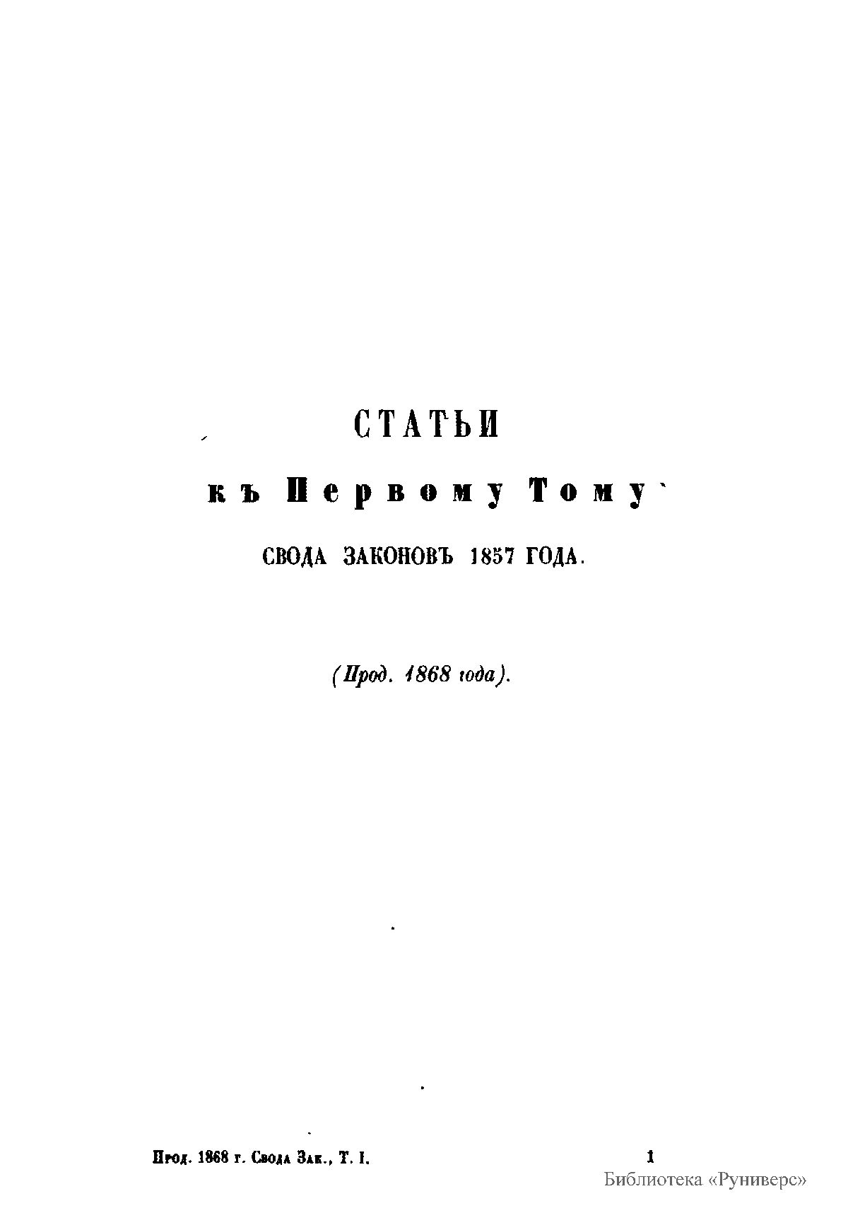 Продолженiе свода законовъ Россiйской имперiи, изданнаго въ 1857 году. Съ 1 января 1864 по 31 декабря 1867 года. Часть I. Статьи къ I, II, III, IV и V томамъ свода