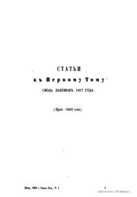 Свод законов Российской империи— официальное собрание расположенных в тематическом порядке действующих законодательных актов Российской империи, созданное при Николае I. Впервые он был напечатан в 1832 году. Манифестом 31 января 1833 года Свод законов был объявлен действующим источником права с 1 января 1835 года. Первое издание 1832 года и последующие 1842-го и 1857 года состояли из пятнадцати томов. После 1857 года Свод законов полностью не переиздавался, а выходили лишь отдельные тома. В качестве отдельного – 16-го тома в 1885 году вышли Судебные уставы. Между изданиями Свода законов выходили ежегодные и сводные (за несколько лет) «Продолжения» Свода законов с указанием на упраздненные и измененные статьи. В своде законов собраны все реально действовавшие в определенный момент времени законы по тем или иным проблемам права, это справочник для юристов. Отбор законодательного материала для включения в Свод производился на основе Полного собрания законов (первое Полное собрание законов, появившееся в 1830 году, состояло из 45 томов, содержащих 30 920 актов и 6 томов приложений). Собрание законов – это в большой степени историческое издание. По нему можно изучать развитие, направление правительственной мысли в стране. Это летопись отечественного законотворчества. Изучая страницу за страницей эту летопись, мы можем узнать, что в тот или иной момент истории являлось злобой дня.