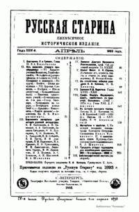 «Русская старина», ежемесячный исторический журнал, выходил в Петербурге в 1870-1918. Основан, издавался и редактировался (1870-1892) М. И. Семевским при участии В. И. Семевского. Последующими редакторами были Н. К. Шильдер (1892-1896), Н. Ф. Дубровин (1896-1904), военные историки С. П. Зыков, П. Н. Воронов.