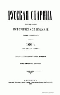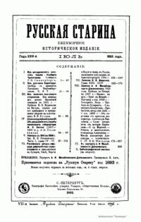 «Русская старина», ежемесячный исторический журнал, выходил в Петербурге в 1870-1918. Основан, издавался и редактировался (1870-1892) М. И. Семевским при участии В. И. Семевского. Последующими редакторами были Н. К. Шильдер (1892-1896), Н. Ф. Дубровин (1896-1904), военные историки С. П. Зыков, П. Н. Воронов.