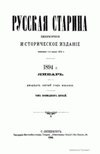 «Русская старина», ежемесячный исторический журнал, выходил в Петербурге в 1870-1918. Основан, издавался и редактировался (1870-1892) М. И. Семевским при участии В. И. Семевского. Последующими редакторами были Н. К. Шильдер (1892-1896), Н. Ф. Дубровин (1896-1904), военные историки С. П. Зыков, П. Н. Воронов.