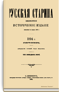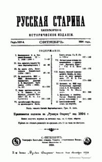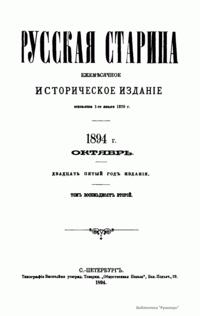 «Русская старина», ежемесячный исторический журнал, выходил в Петербурге в 1870-1918. Основан, издавался и редактировался (1870-1892) М. И. Семевским при участии В. И. Семевского. Последующими редакторами были Н. К. Шильдер (1892-1896), Н. Ф. Дубровин (1896-1904), военные историки С. П. Зыков, П. Н. Воронов.