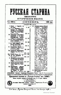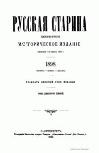«Русская старина», ежемесячный исторический журнал, выходил в Петербурге в 1870-1918. Основан, издавался и редактировался (1870-1892) М. И. Семевским при участии В. И. Семевского. Последующими редакторами были Н. К. Шильдер (1892-1896), Н. Ф. Дубровин (1896-1904), военные историки С. П. Зыков, П. Н. Воронов.