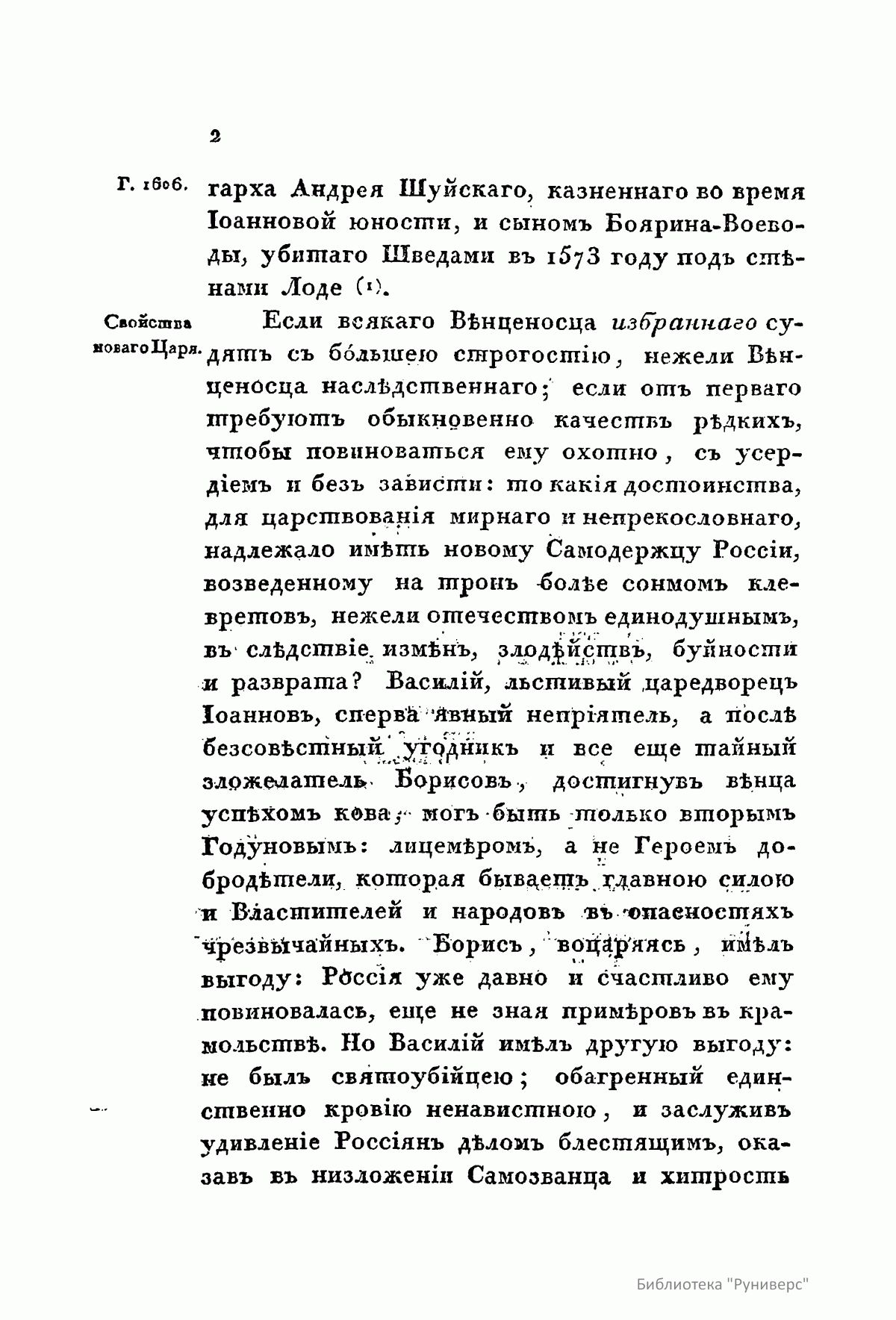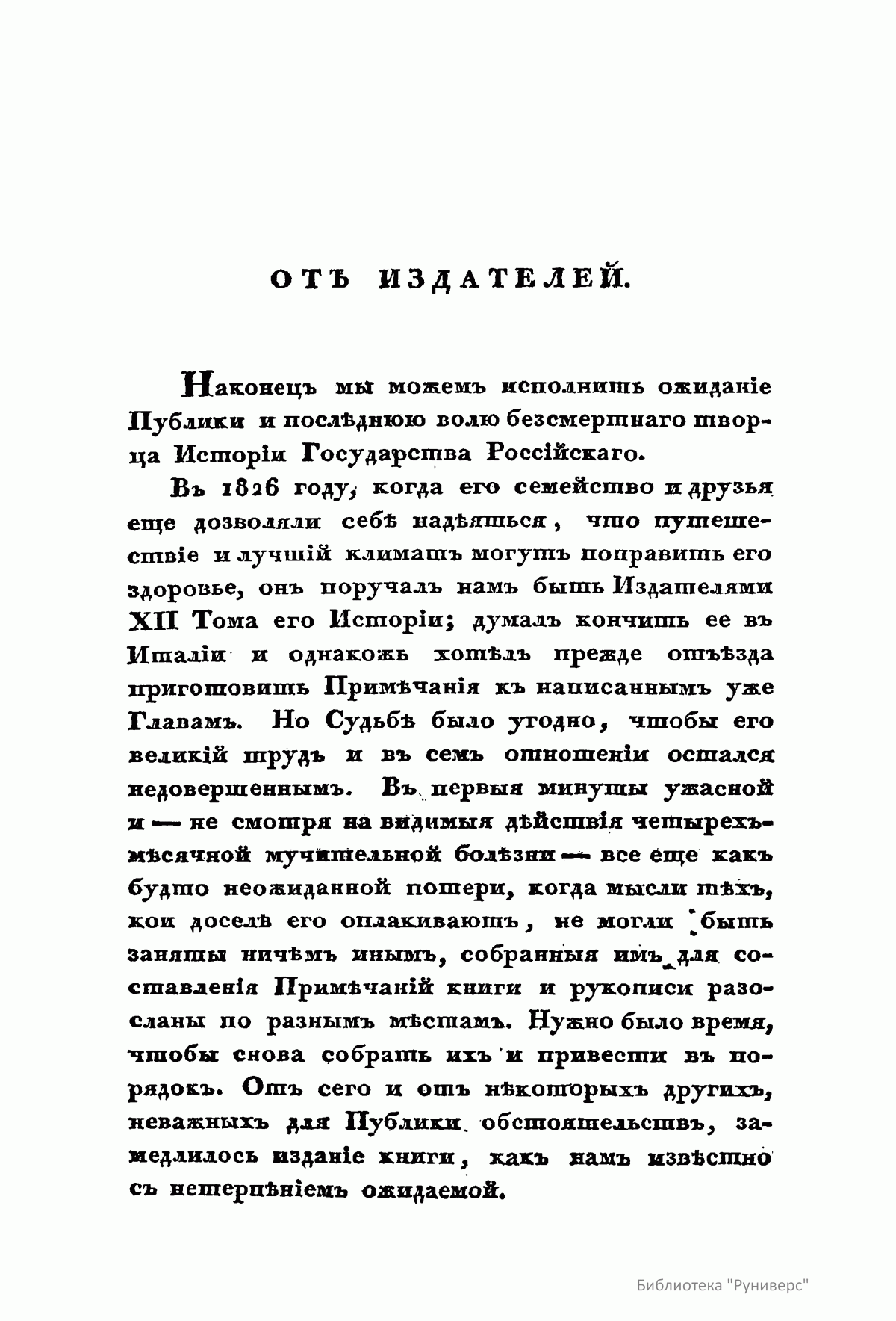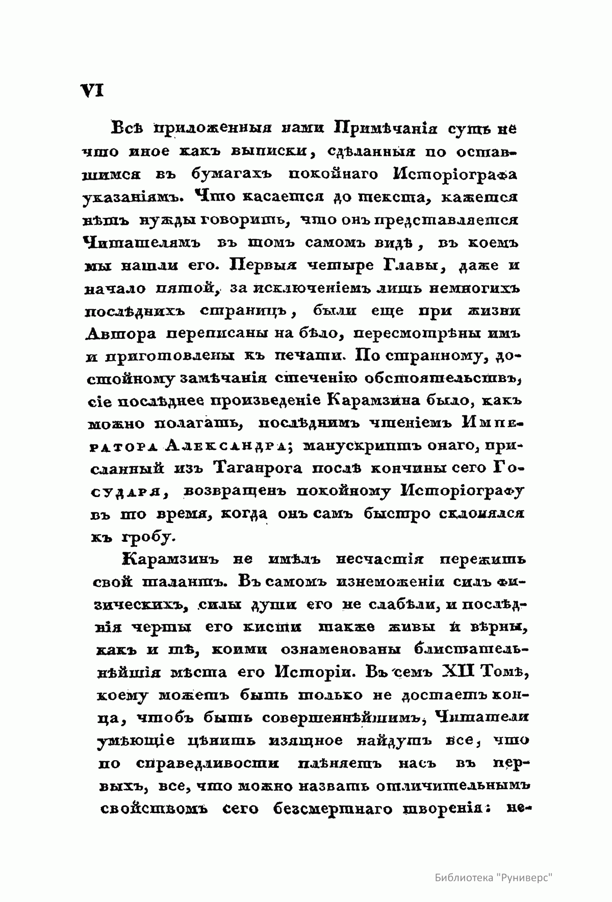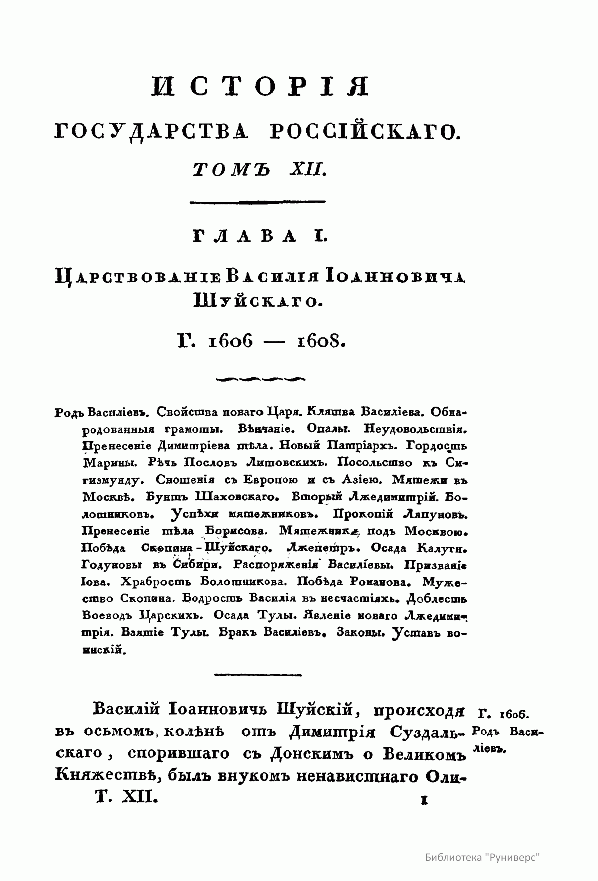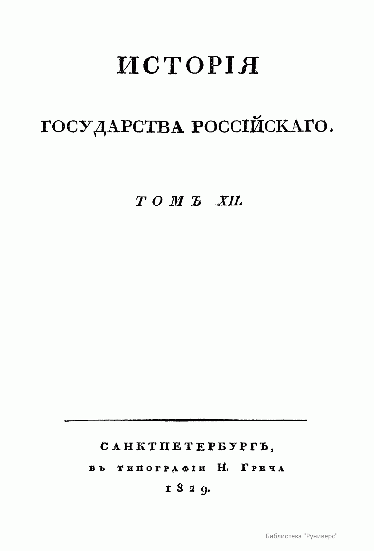 В 1816 году он выпустил первые восемь томов «Истории государства Российского», трёхтысячный тираж которых разошелся в течение месяца. В последующие годы вышли еще три тома «Истории», появился ряд переводов её на главнейшие европейские языки. Тенденциозно-монархическое освещение русского исторического процесса сблизило Карамзина с двором и царем, поселившим его подле себя в Царском Селе. Незаконченный XII том был издан уже после его смерти.