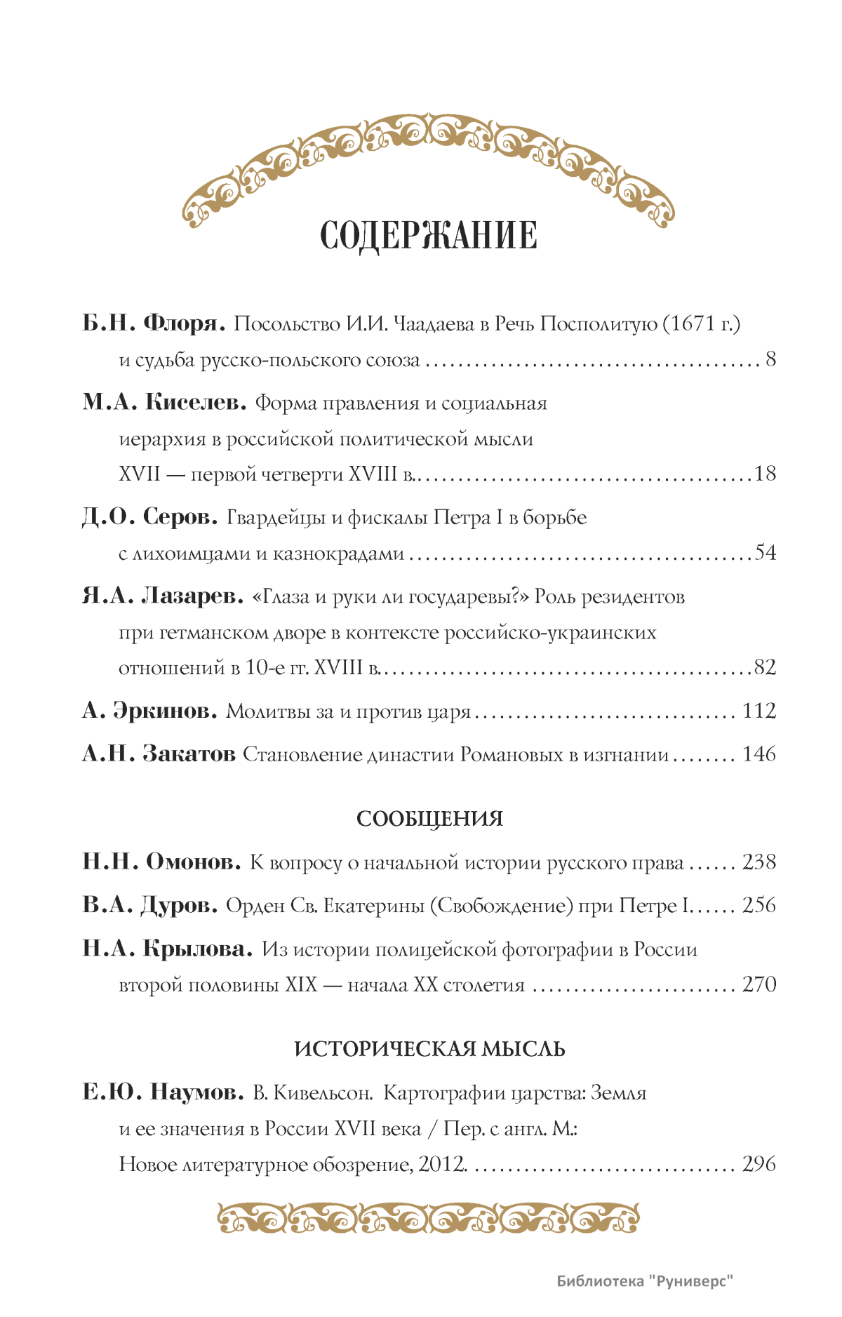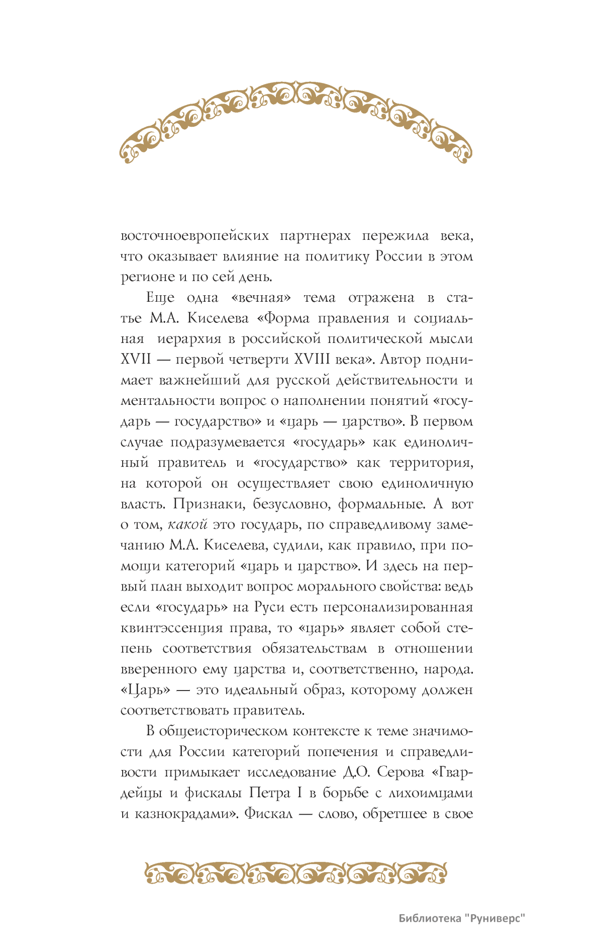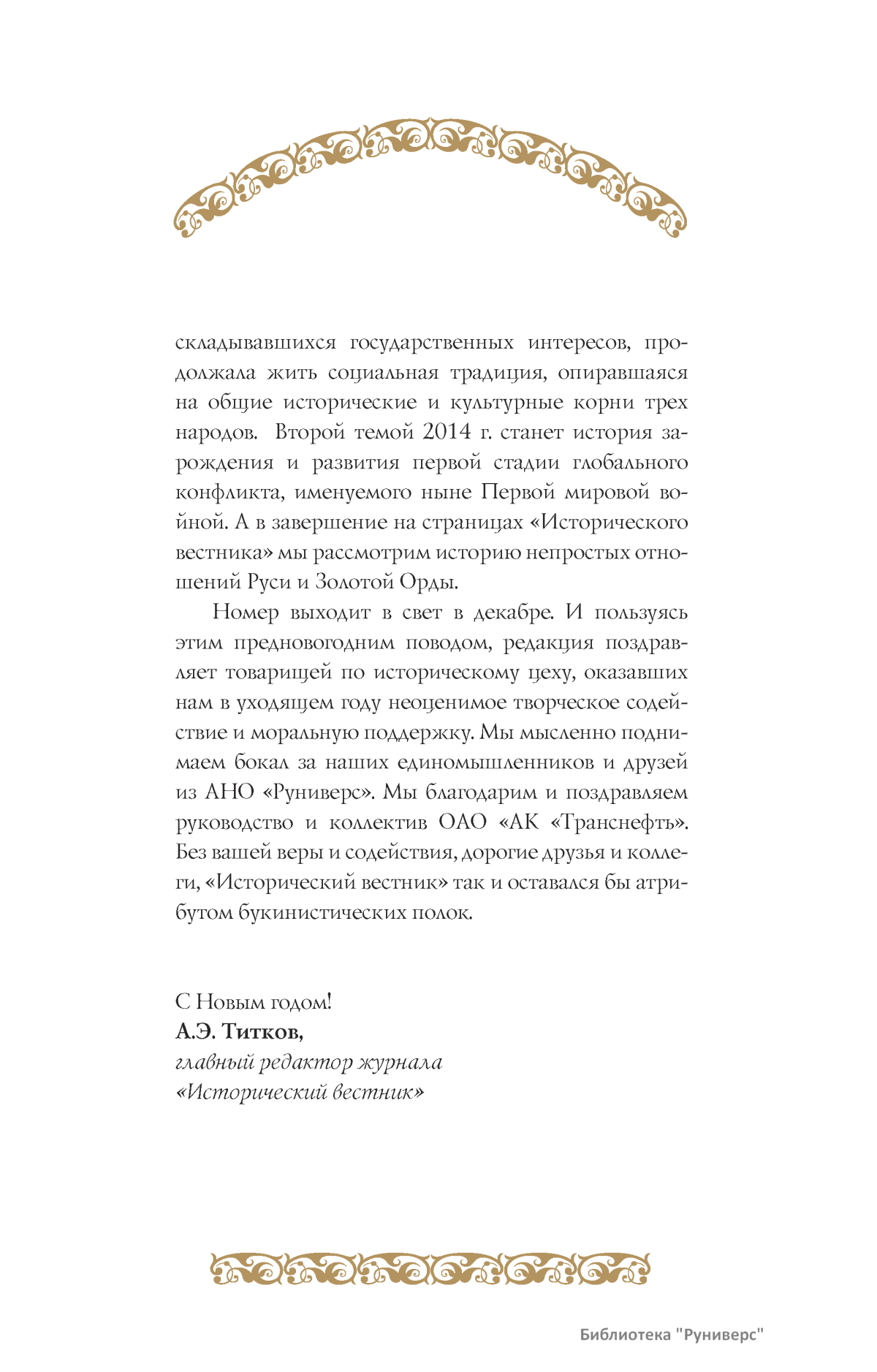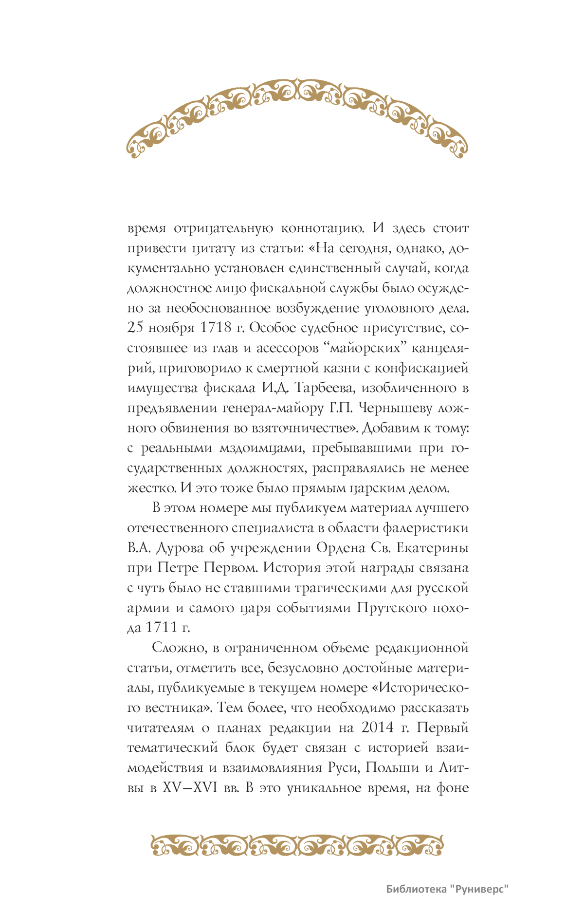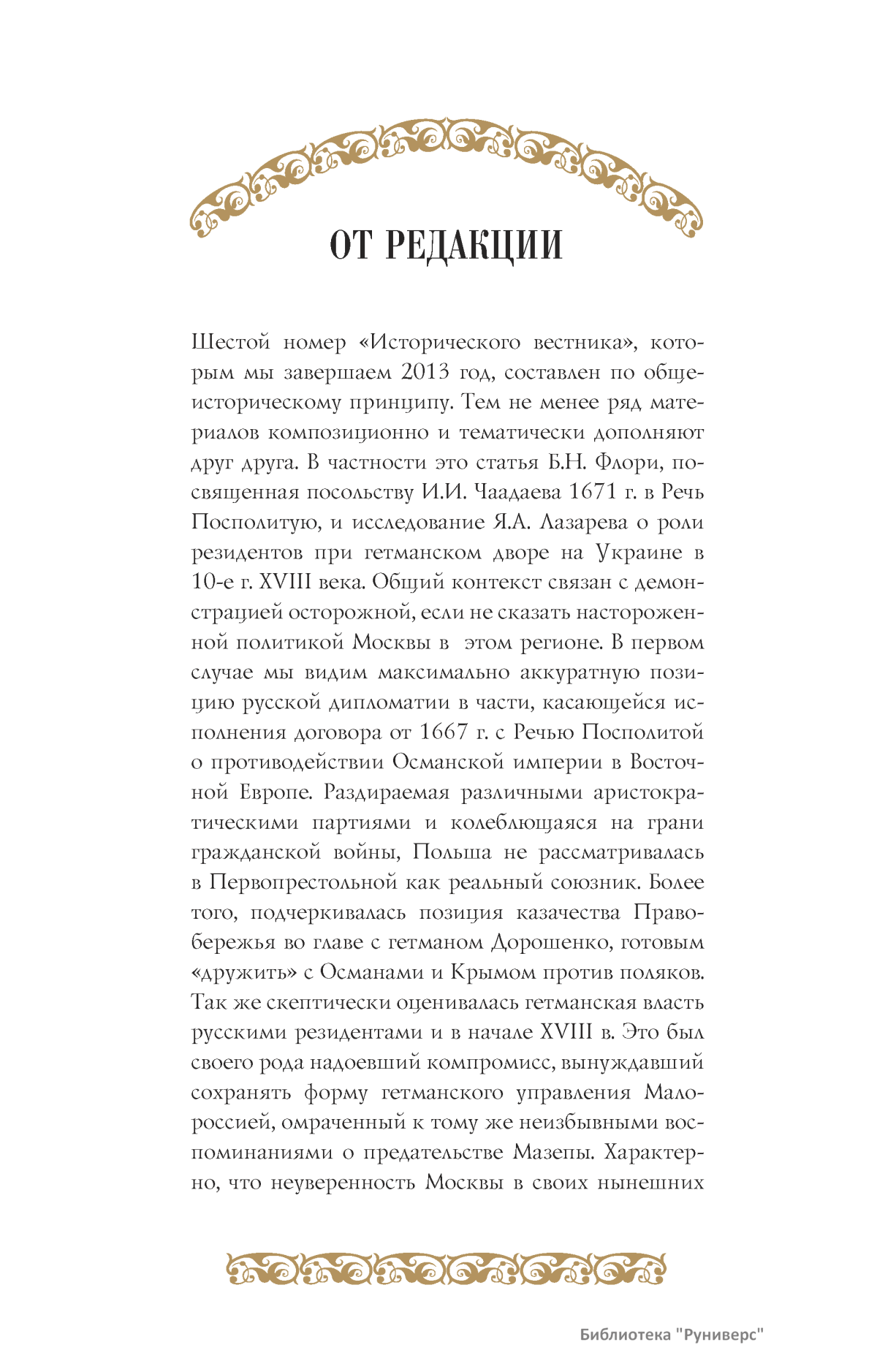 Шестой номер «Исторического вестника», которым мы завершаем 2013 год, составлен по общеисторическому принципу. Тем не менее ряд материалов композиционно и тематически дополняют друг друга. В частности это статья Б.Н. Флори, посвященная посольству И.И. Чаадаева 1671 г. в Речь Посполитую, и исследование Я.А. Лазарева о роли резидентов при гетманском дворе на Украине в 10-е г. XVIII века. Общий контекст связан с демонстрацией осторожной, если не сказать настороженной политикой Москвы в этом регионе. В первом случае мы видим максимально аккуратную позицию русской дипломатии в части, касающейся исполнения договора от 1667 г. с Речью Посполитой о противодействии Османской империи в Восточной Европе. Раздираемая различными аристократическими партиями и колеблющаяся на грани гражданской войны, Польша не рассматривалась в Первопрестольной как реальный союзник. Более того, подчеркивалась позиция казачества Правобережья во главе с гетманом Дорошенко, готовым «дружить» с Османами и Крымом против поляков. Так же скептически оценивалась гетманская власть русскими резидентами и в начале XVIII в. Это был своего рода надоевший компромисс, вынуждавший сохранять форму гетманского управления Малороссией, омраченный к тому же неизбывными воспоминаниями о предательстве Мазепы. Характерно, что неуверенность Москвы в своих нынешних восточноевропейских партнерах пережила века, что оказывает влияние на политику России в этом регионе и по сей день. Еще одна «вечная» тема отражена в статье М.А. Киселева «Форма правления и социальная иерархия в российской политической мысли XVII — первой четверти XVIII века». Автор поднимает важнейший для русской действительности и ментальности вопрос о наполнении понятий «государь — государство» и «царь — царство». В первом случае подразумевается «государь» как единоличный правитель и «государство» как территория, на которой он осуществляет свою единоличную власть. Признаки, безусловно, формальные. А вот о том, какой это государь, по справедливому замечанию М.А. Киселева, судили, как правило, при помощи категорий «царь и царство». И здесь на первый план выходит вопрос морального свойства: ведь если «государь» на Руси есть персонализированная квинтэссенция права, то «царь» являет собой степень соответствия обязательствам в отношении вверенного ему царства и, соответственно, народа. «Царь» — это идеальный образ, которому должен соответствовать правитель. В общеисторическом контексте к теме значимости для России категорий попечения и справедливости примыкает исследование Д.О. Серова «Гвардейцы и фискалы Петра I в борьбе с лихоимцами и казнокрадами». Фискал — слово, обретшее в свое время отрицательную коннотацию. И здесь стоит привести цитату из статьи: «На сегодня, однако, документально установлен единственный случай, когда должностное лицо фискальной службы было осуждено за необоснованное возбуждение уголовного дела. 25 ноября 1718 г. Особое судебное присутствие, состоявшее из глав и асессоров “майорских” канцелярий, приговорило к смертной казни с конфискацией имущества фискала И.Д. Тарбеева, изобличенного в предъявлении генерал-майору Г.П. Чернышеву ложного обвинения во взяточничестве». Добавим к тому: с реальными мздоимцами, пребывавшими при государственных должностях, расправлялись не менее жестко. И это тож