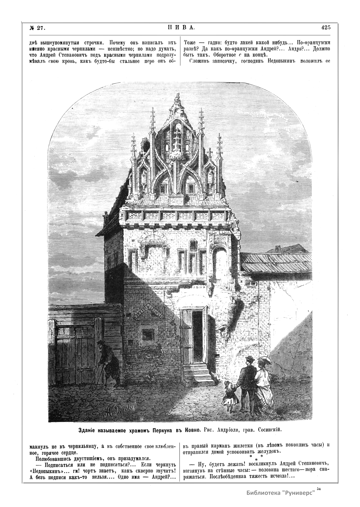 «Нива» — популярный еженедельный русский журнал с приложениями, издававшийся со второй половины XIX до начала XX века, носил подзаголовок «Журнал литературы, политики и современной жизни». Журнал был любимым детищем А. Ф. Маркса, возглавлявшего свое издательство вплоть до своей смерти в 1904 г. Позиционировалась «Нива» как иллюстрированный журнал для семейного чтения и был ориентирован, главным образом, на обывателя. В журнале публиковались литературные произведения, исторические, научно-популярные очерки, репродукции и гравюры картин современных художников. Материалы политического и общественного содержания также сопровождались многочисленными иллюстрациями. Среди известных литераторов, печатавшихся в журнале, были А. К. Толстой, Ф. И. Тютчев, Л. Н. Толстой, А. А. Фет, А. П. Чехов, Максим Горький, Корней Чуковский, Анна Ахматова, Иван Бунин и многие другие. Благодаря «Ниве» сочинения многих современных авторов добрались до самых отдаленных областей России.