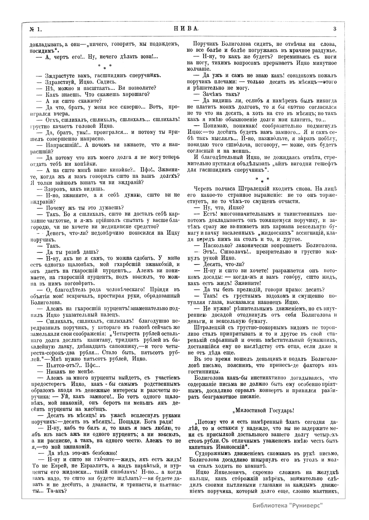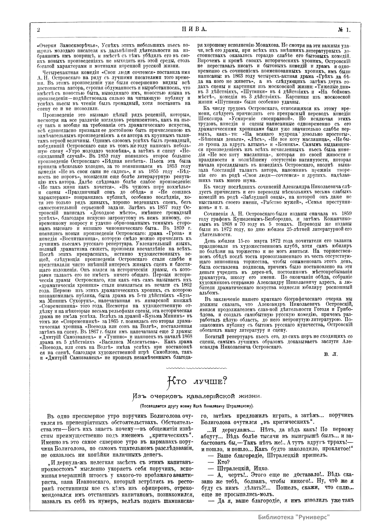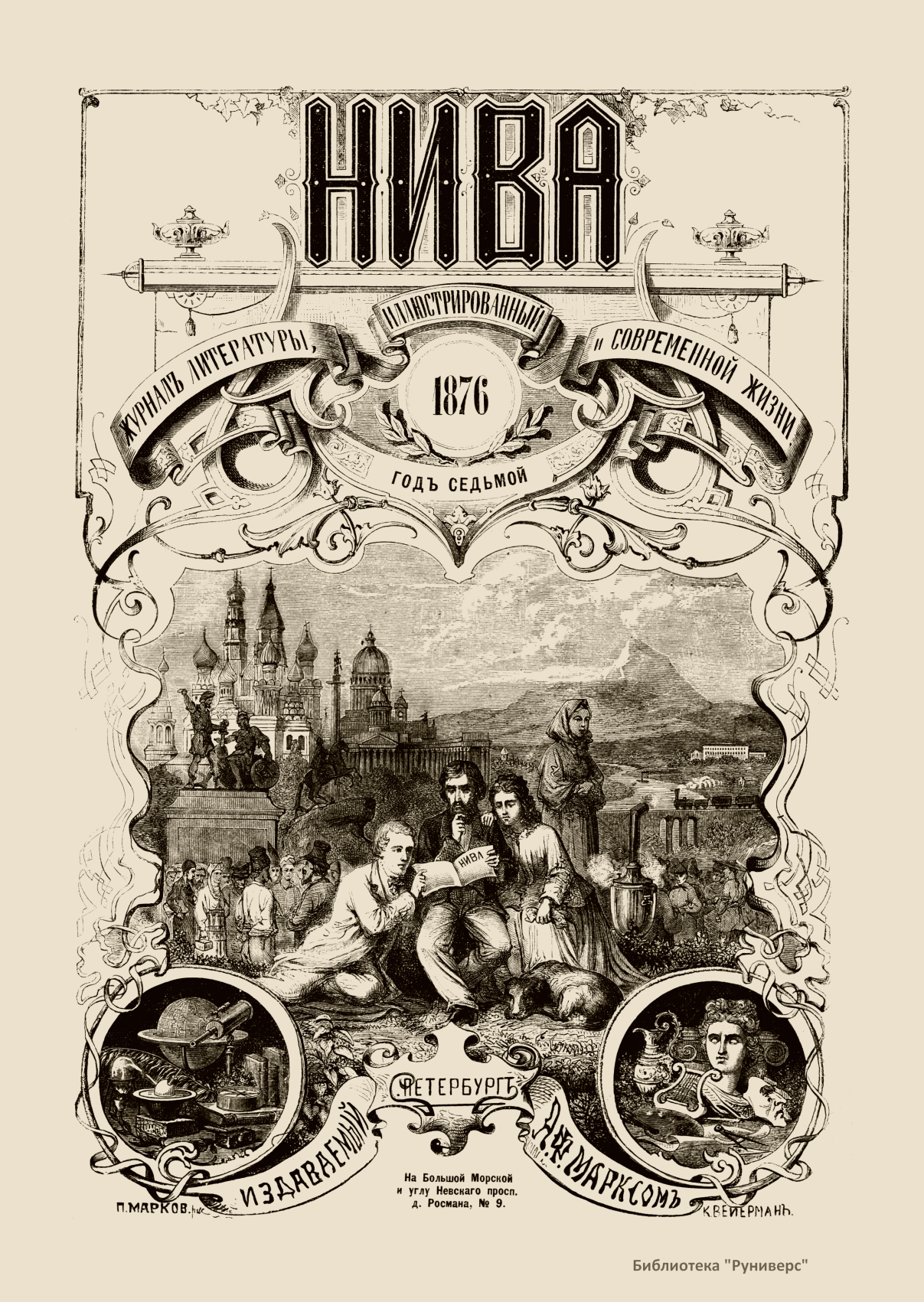 «Нива» — популярный еженедельный русский журнал с приложениями, издававшийся со второй половины XIX до начала XX века, носил подзаголовок «Журнал литературы, политики и современной жизни». Журнал был любимым детищем А. Ф. Маркса, возглавлявшего свое издательство вплоть до своей смерти в 1904 г. Позиционировалась «Нива» как иллюстрированный журнал для семейного чтения и был ориентирован, главным образом, на обывателя. В журнале публиковались литературные произведения, исторические, научно-популярные очерки, репродукции и гравюры картин современных художников. Материалы политического и общественного содержания также сопровождались многочисленными иллюстрациями. Среди известных литераторов, печатавшихся в журнале, были А. К. Толстой, Ф. И. Тютчев, Л. Н. Толстой, А. А. Фет, А. П. Чехов, Максим Горький, Корней Чуковский, Анна Ахматова, Иван Бунин и многие другие. Благодаря «Ниве» сочинения многих современных авторов добрались до самых отдаленных областей России.