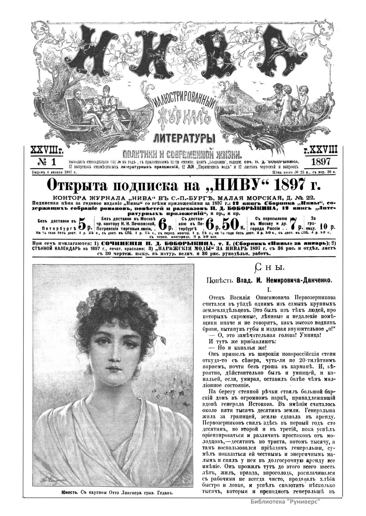 «Нива» — популярный еженедельный русский журнал с приложениями, издававшийся со второй половины XIX до начала XX века, носил подзаголовок «Журнал литературы, политики и современной жизни». Журнал был любимым детищем А. Ф. Маркса, возглавлявшего свое издательство вплоть до своей смерти в 1904 г. Позиционировалась «Нива» как иллюстрированный журнал для семейного чтения и был ориентирован, главным образом, на обывателя. В журнале публиковались литературные произведения, исторические, научно-популярные очерки, репродукции и гравюры картин современных художников. Материалы политического и общественного содержания также сопровождались многочисленными иллюстрациями. Среди известных литераторов, печатавшихся в журнале, были А. К. Толстой, Ф. И. Тютчев, Л. Н. Толстой, А. А. Фет, А. П. Чехов, Максим Горький, Корней Чуковский, Анна Ахматова, Иван Бунин и многие другие. Благодаря «Ниве» сочинения многих современных авторов добрались до самых отдаленных областей России.