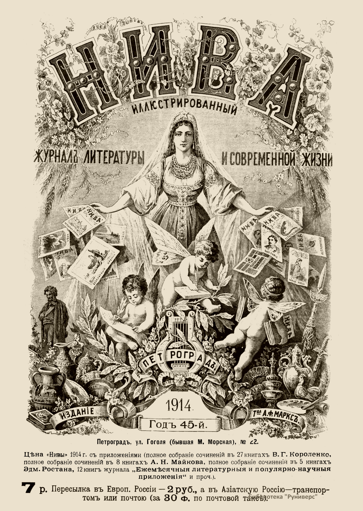 «Нива» — популярный еженедельный русский журнал с приложениями, издававшийся со второй половины XIX до начала XX века, носил подзаголовок «Журнал литературы, политики и современной жизни». Журнал был любимым детищем А. Ф. Маркса, возглавлявшего свое издательство вплоть до своей смерти в 1904 г. Позиционировалась «Нива» как иллюстрированный журнал для семейного чтения и был ориентирован, главным образом, на обывателя. В журнале публиковались литературные произведения, исторические, научно-популярные очерки, репродукции и гравюры картин современных художников. Материалы политического и общественного содержания также сопровождались многочисленными иллюстрациями. Среди известных литераторов, печатавшихся в журнале, были А. К. Толстой, Ф. И. Тютчев, Л. Н. Толстой, А. А. Фет, А. П. Чехов, Максим Горький, Корней Чуковский, Анна Ахматова, Иван Бунин и многие другие. Благодаря «Ниве» сочинения многих современных авторов добрались до самых отдаленных областей России.