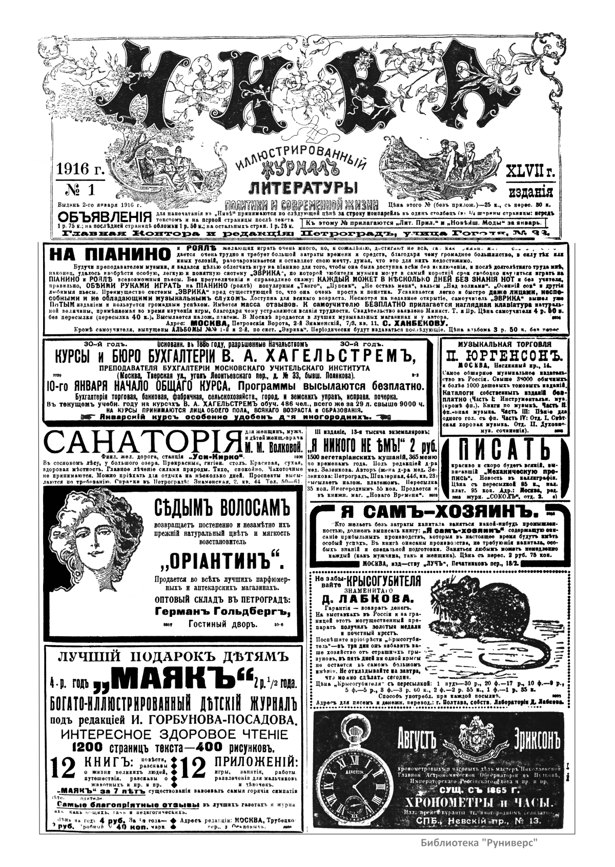 «Нива» — популярный еженедельный русский журнал с приложениями, издававшийся со второй половины XIX до начала XX века, носил подзаголовок «Журнал литературы, политики и современной жизни». Журнал был любимым детищем А. Ф. Маркса, возглавлявшего свое издательство вплоть до своей смерти в 1904 г. Позиционировалась «Нива» как иллюстрированный журнал для семейного чтения и был ориентирован, главным образом, на обывателя. В журнале публиковались литературные произведения, исторические, научно-популярные очерки, репродукции и гравюры картин современных художников. Материалы политического и общественного содержания также сопровождались многочисленными иллюстрациями. Среди известных литераторов, печатавшихся в журнале, были А. К. Толстой, Ф. И. Тютчев, Л. Н. Толстой, А. А. Фет, А. П. Чехов, Максим Горький, Корней Чуковский, Анна Ахматова, Иван Бунин и многие другие. Благодаря «Ниве» сочинения многих современных авторов добрались до самых отдаленных областей России.