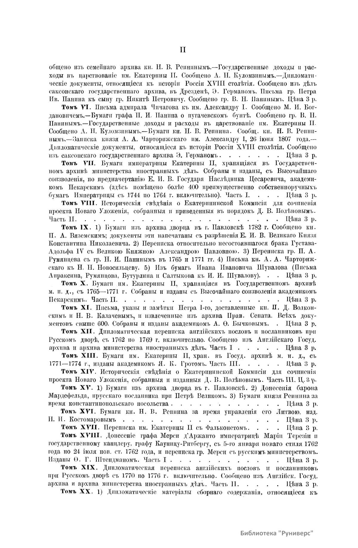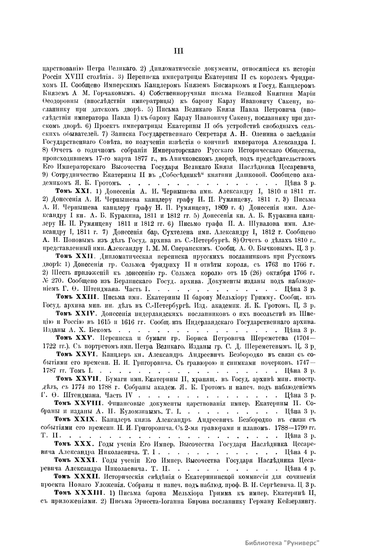 Сборники Русского исторического общества (РИО) – крупнейшая серийная публикация источников по истории России XVIII–XIX веков. За пятьдесят лет существования Общества (1866–1916) было выпущено 148 томов Сборника. Тематика опубликованных в Сборнике материалов обширна и включает в себя документы, относящиеся как к внутренней, так и внешней политике государства. Среди них можно выделить шесть крупных серий: «Материалы по истории Екатерининской комиссии для сочинения проекта нового Уложения 1767 г.», «Бумаги Екатерины II», «Материалы для истории высших государственных учреждений России в XVIII в.», «Материалы для политической и бытовой истории в 1812 г.», «Дипломатическая переписка иностранных послов и посланников при русском дворе», «Памятники дипломатических отношений древней России с державами иностранными», включающие документы XV–XVII веков, перешедшие в РИО от Второго отделения императорской канцелярии. Помимо этих серий в Сборнике публиковались личные бумаги Петра I, Петра II, Екатерины I, Александра I, Николая I, Александра II, а также документы, связанные с деятельностью видных государственных сановников. В Сборнике выходили отчёты о годичных собраниях РИО. Во время подготовки издания Русского биографического словаря в томах 60 и 62 был помещён Азбучный указатель имён русских деятелей для словаря. Основная работа по подготовке издания Сборника лежала на ответственных секретарях РИО. Первым таким секретарём стал один из наиболее деятельных организаторов Общества А. А. Половцев. В разное время в работе Общества принимали участие крупные историки: С. М. Соловьёв, В. О. Ключевский, Н. И. Костомаров, Н. Ф. Дубровин, П. П. Пекарский, В. И. Сергеевич, Я. К. Грот, А. Н. Филиппов, И. Е. Забелин, А. Н. Пыпин, С. Ф. Платонов, В. С. Иконников, Н. Д. Чечулин, А. Н. Попов.