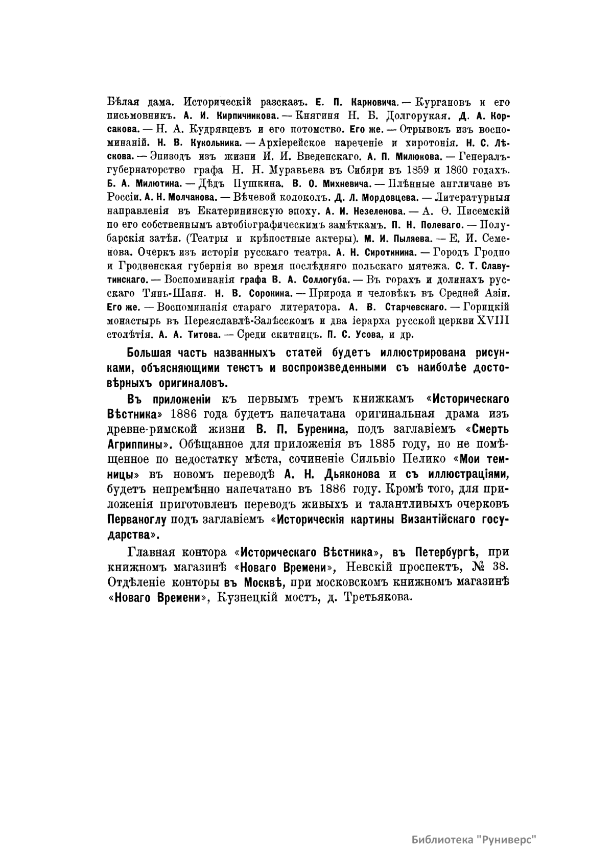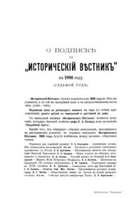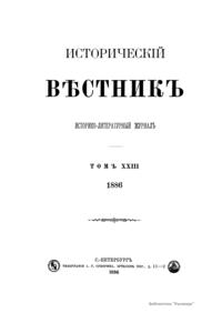 «Исторический вестник» - русский ежемесячный историко-литературный журнал. Издавался в Санкт-Петербурге с 1880-го по 1917 г. Журнал был основан А.С. Сувориным и С.Н. Шубинским с целью «знакомить читателей в живой, общедоступной форме с современным состоянием исторической науки и литературы в России и Европе». Вышло 150 тт. Каждый том состоял из трёх ежемесячных выпусков, имел свою нумерацию страниц, оглавление, список иллюстраций. Журнал приобрёл устойчивую популярность среди читателей, заняв прочное место в «триумвирате» русских исторических журналов наряду с «Русским архивом» и «Русской стариной». опережая их по количеству подписчиков. Отличием «Исторического вестника» было то, что он не помещал на своих страницах необработанных, сырых материалов. С другой стороны, журнал приближался по своему типу к журналам общелитературного образца, сочетая в себе коммерческий успех и доступное изложение материала.