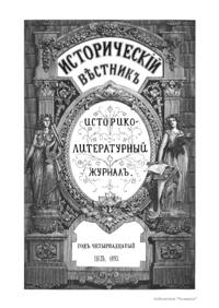 «Исторический вестник» - русский ежемесячный историко-литературный журнал. Издавался в Санкт-Петербурге с 1880-го по 1917 г. Журнал был основан А.С. Сувориным и С.Н. Шубинским с целью «знакомить читателей в живой, общедоступной форме с современным состоянием исторической науки и литературы в России и Европе». Вышло 150 тт. Каждый том состоял из трёх ежемесячных выпусков, имел свою нумерацию страниц, оглавление, список иллюстраций. Журнал приобрёл устойчивую популярность среди читателей, заняв прочное место в «триумвирате» русских исторических журналов наряду с «Русским архивом» и «Русской стариной». опережая их по количеству подписчиков. Отличием «Исторического вестника» было то, что он не помещал на своих страницах необработанных, сырых материалов. С другой стороны, журнал приближался по своему типу к журналам общелитературного образца, сочетая в себе коммерческий успех и доступное изложение материала.