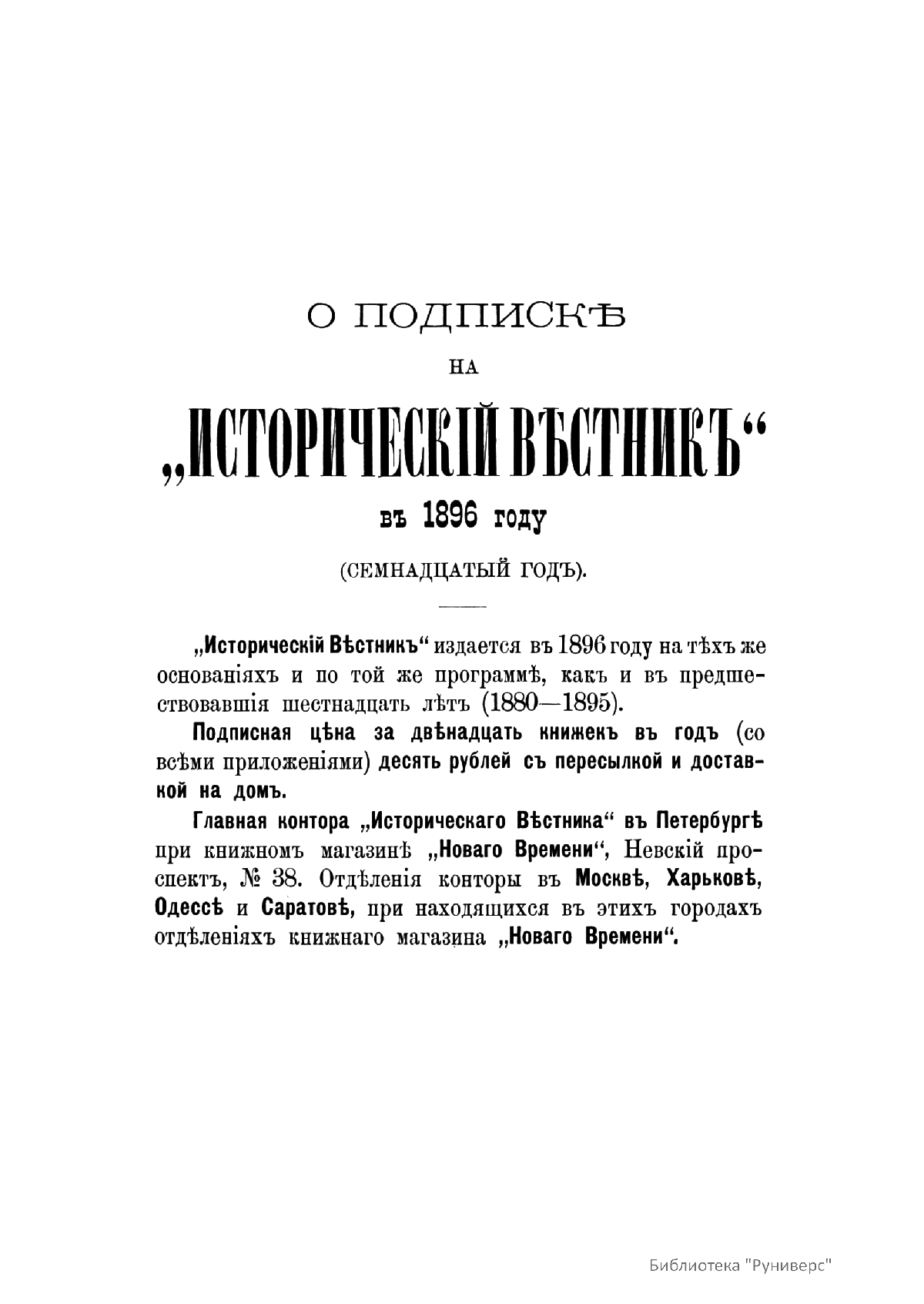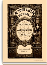 «Исторический вестник» - русский ежемесячный историко-литературный журнал. Издавался в Санкт-Петербурге с 1880-го по 1917 г. Журнал был основан А.С. Сувориным и С.Н. Шубинским с целью «знакомить читателей в живой, общедоступной форме с современным состоянием исторической науки и литературы в России и Европе». Вышло 150 тт. Каждый том состоял из трёх ежемесячных выпусков, имел свою нумерацию страниц, оглавление, список иллюстраций. Журнал приобрёл устойчивую популярность среди читателей, заняв прочное место в «триумвирате» русских исторических журналов наряду с «Русским архивом» и «Русской стариной». опережая их по количеству подписчиков. Отличием «Исторического вестника» было то, что он не помещал на своих страницах необработанных, сырых материалов. С другой стороны, журнал приближался по своему типу к журналам общелитературного образца, сочетая в себе коммерческий успех и доступное изложение материала.
