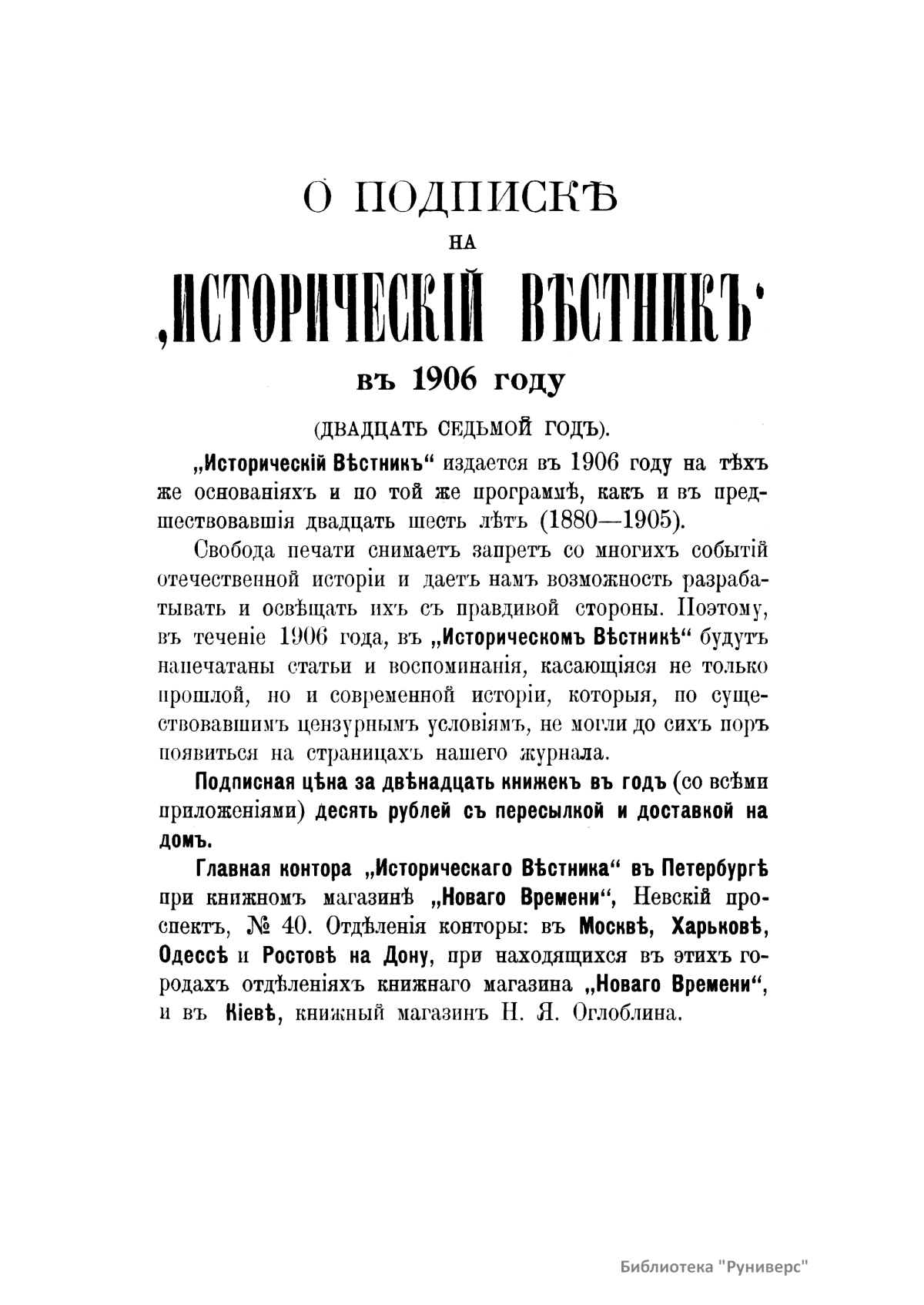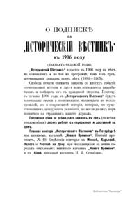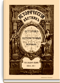 «Исторический вестник» - русский ежемесячный историко-литературный журнал. Издавался в Санкт-Петербурге с 1880-го по 1917 г. Журнал был основан А.С. Сувориным и С.Н. Шубинским с целью «знакомить читателей в живой, общедоступной форме с современным состоянием исторической науки и литературы в России и Европе». Вышло 150 тт. Каждый том состоял из трёх ежемесячных выпусков, имел свою нумерацию страниц, оглавление, список иллюстраций. Журнал приобрёл устойчивую популярность среди читателей, заняв прочное место в «триумвирате» русских исторических журналов наряду с «Русским архивом» и «Русской стариной». опережая их по количеству подписчиков. Отличием «Исторического вестника» было то, что он не помещал на своих страницах необработанных, сырых материалов. С другой стороны, журнал приближался по своему типу к журналам общелитературного образца, сочетая в себе коммерческий успех и доступное изложение материала.