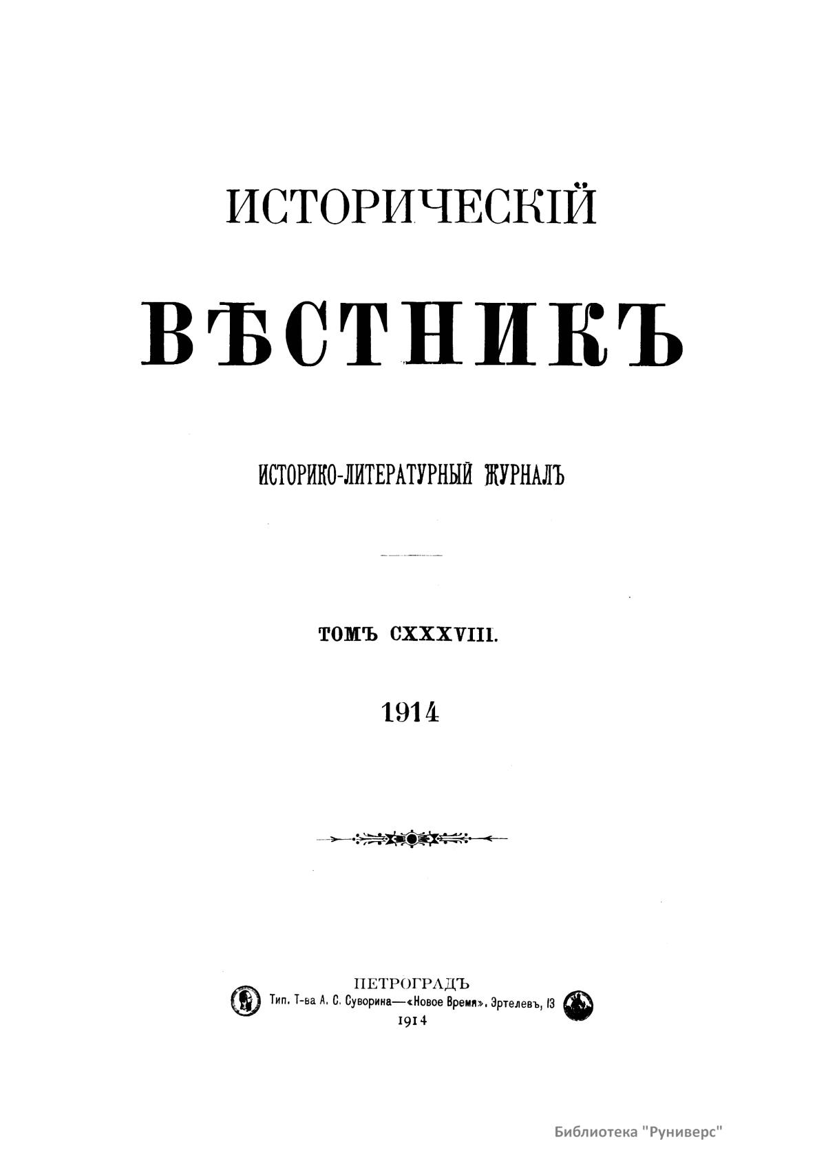 Исторический вестник. Историко-литературный журнал. Том CXXXVIII