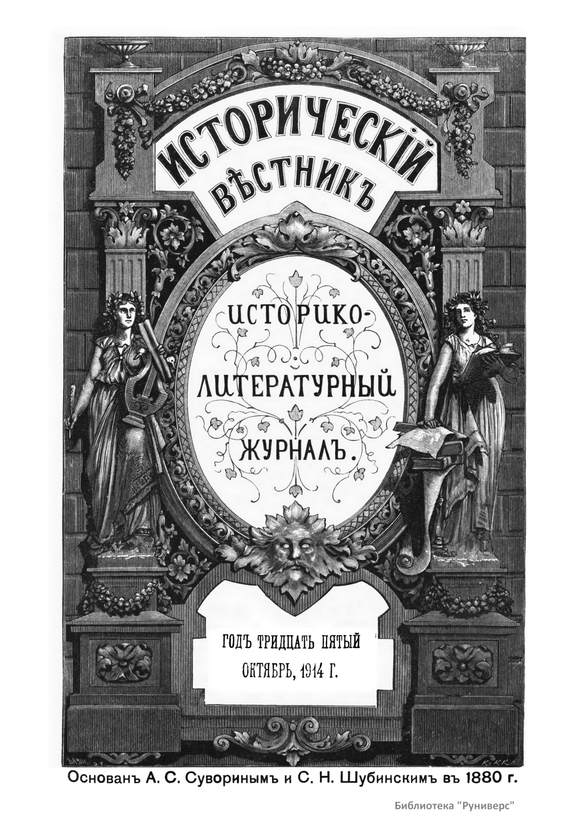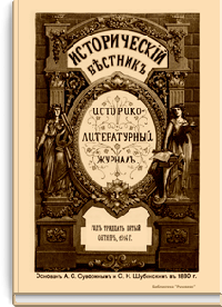 «Исторический вестник» - русский ежемесячный историко-литературный журнал. Издавался в Санкт-Петербурге с 1880-го по 1917 г. Журнал был основан А.С. Сувориным и С.Н. Шубинским с целью «знакомить читателей в живой, общедоступной форме с современным состоянием исторической науки и литературы в России и Европе». Вышло 150 тт. Каждый том состоял из трёх ежемесячных выпусков, имел свою нумерацию страниц, оглавление, список иллюстраций. Журнал приобрёл устойчивую популярность среди читателей, заняв прочное место в «триумвирате» русских исторических журналов наряду с «Русским архивом» и «Русской стариной». опережая их по количеству подписчиков. Отличием «Исторического вестника» было то, что он не помещал на своих страницах необработанных, сырых материалов. С другой стороны, журнал приближался по своему типу к журналам общелитературного образца, сочетая в себе коммерческий успех и доступное изложение материала.