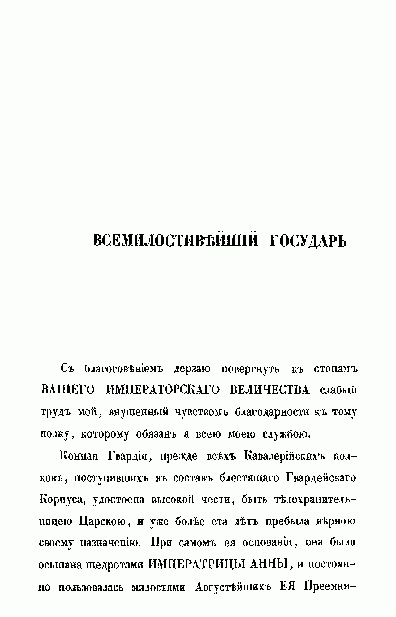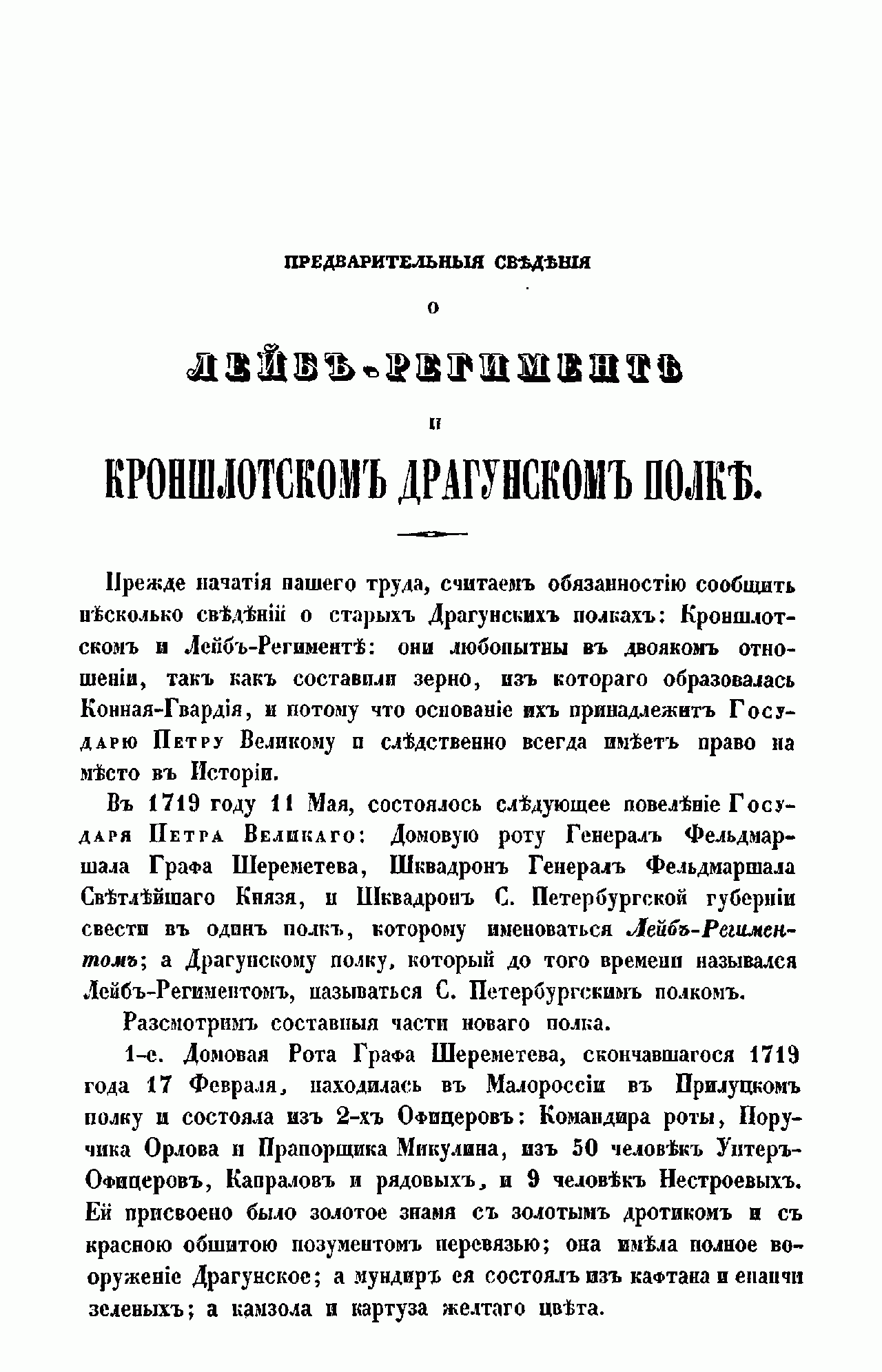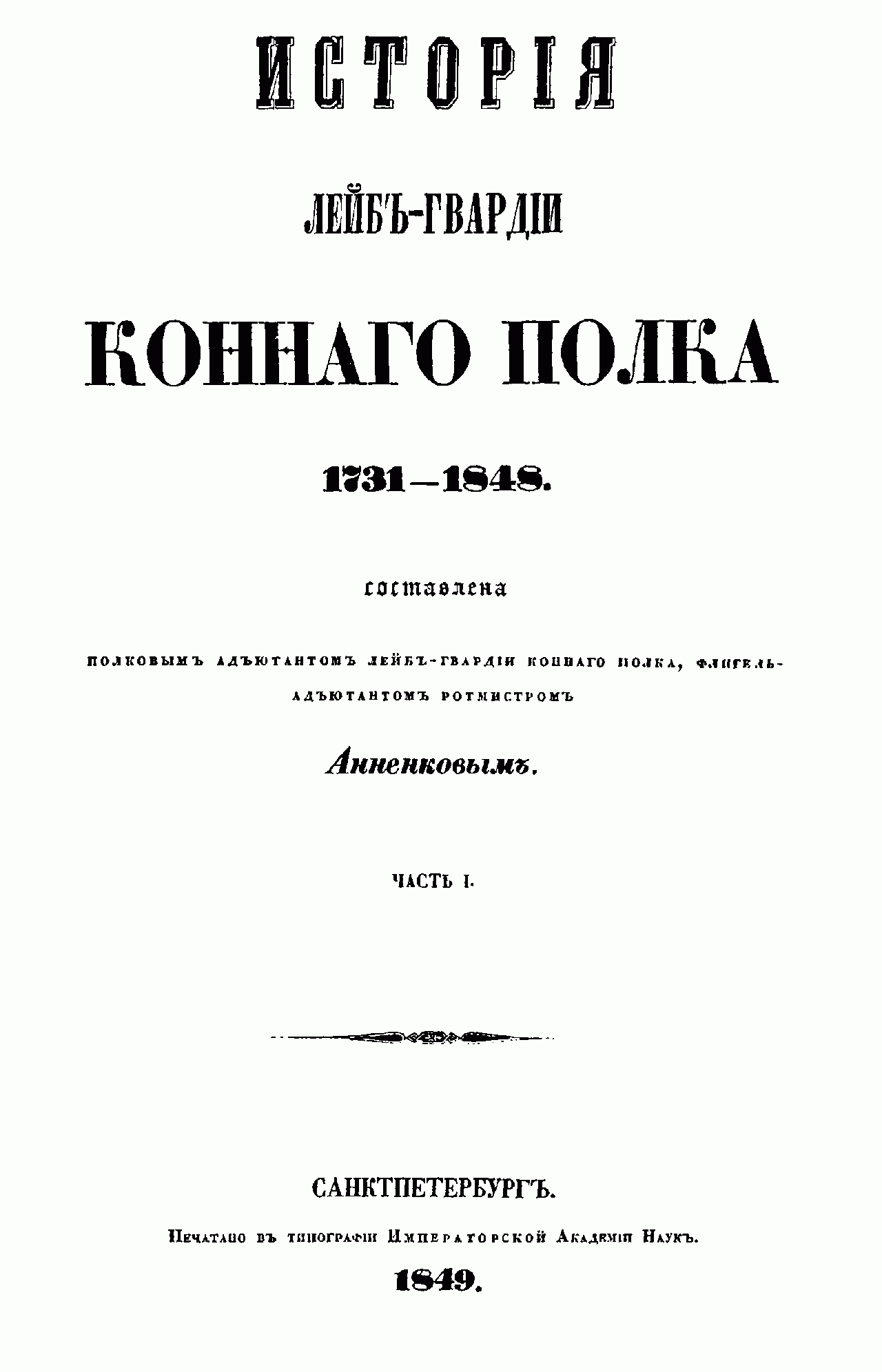 Лейб-гвардии Конный полк был сформирован в 1730 году как Конная гвардия из Кроншлотского драгунского полка, ведущего историю с 1706 года. Полк участвовал в войнах с Турцией, Швецией, Францией, подавлении Польского восстания 1831 года, участвовал в Первой мировой войне. Полк был одной из самых аристократических и блестящих частей гвардии, его командирами или шефами являлись императоры. Начальную историю Конного полка вы можете узнать, познакомившись с книгой И. В. Анненкова. Анненков Иван Васильевич — генерал-адъютант, генерал от кавалерии (1814–1887). Окончив курс в школе гвардейских подпрапорщиков и кавалерийских юнкеров в 1833 году, он вышел прапорщиком в лейб-гвардии Конный полк, где прослужил до 1852 года. В 1849 году Анненковым составлена обширная «История лейб-гвардии Конного полка, от 1731 до 1848 года». Всего было подготовлено 4 части и атлас на 25 листах. История полка представлена по периодам царствующих особ, в книге широко представлен статистический материал.