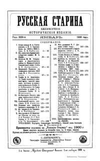 «Русская старина», ежемесячный исторический журнал, выходил в Петербурге в 1870-1918. Основан, издавался и редактировался (1870-1892) М. И. Семевским при участии В. И. Семевского. Последующими редакторами были Н. К. Шильдер (1892-1896), Н. Ф. Дубровин (1896-1904), военные историки С. П. Зыков, П. Н. Воронов.