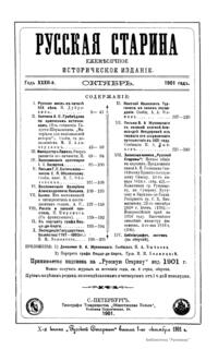 «Русская старина», ежемесячный исторический журнал, выходил в Петербурге в 1870-1918. Основан, издавался и редактировался (1870-1892) М. И. Семевским при участии В. И. Семевского. Последующими редакторами были Н. К. Шильдер (1892-1896), Н. Ф. Дубровин (1896-1904), военные историки С. П. Зыков, П. Н. Воронов.