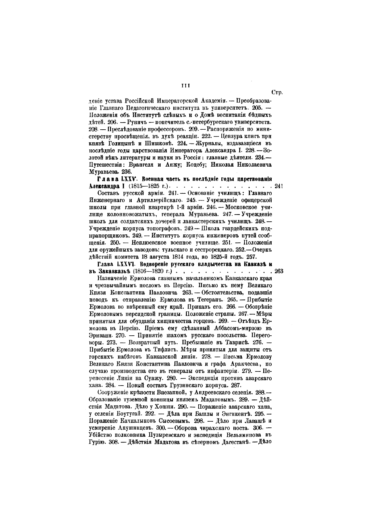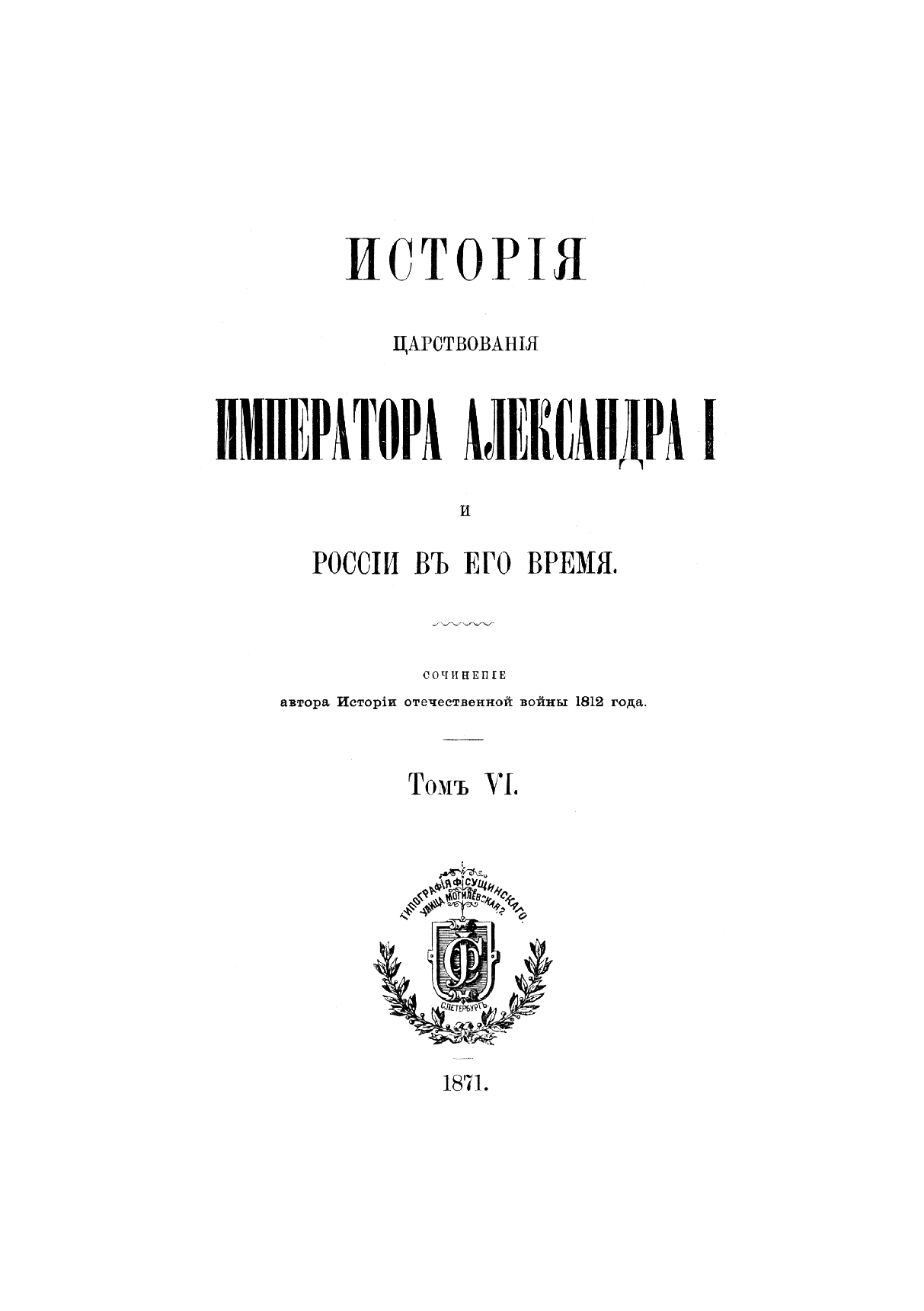 «История царствования императора Александра I и России в его время» вышла в свет в 1869–1871 гг. Ее автор, Богданович Модест Иванович (1805–1882), — генерал-лейтенант, военный писатель. В 1831 г. участвовал в сражениях под Вавром, Гроховым, Дембе-Вельке и Рагозиным. Пройдя курс в военной академии, занял в ней кафедру военной истории и стратегии, был членом Военного совета, официальным военным историографом. Оставил после себя множество военно-исторических и исторических трудов, в которых интересуется, главным образом, политической историей; его попытки критически отнестись к создавшимся легендам были встречены официальными историками весьма недоброжелательно. Повествование разделено на две части: первая, заключающаяся в I–IV томах, охватывает события 1801–1815 гг.; вторая — V, VI тома — содержит исторический период после 1815 г. до кончины Александра I в 1825 г. При создании книги Богданович использовал сведения из государственных архивов, а также до того не издававшиеся документы: бумаги императора Александра I, графа П. А. Строганова, записки адмирала А. С. Шишкова, журнал морских походов Д. Н. Сенявина и др. Полный список источников, печатных книг и рукописей, приведен в конце шестого тома. Богатый фактический материал иллюстрируют карты театров военных действий и планы главных сражений.
