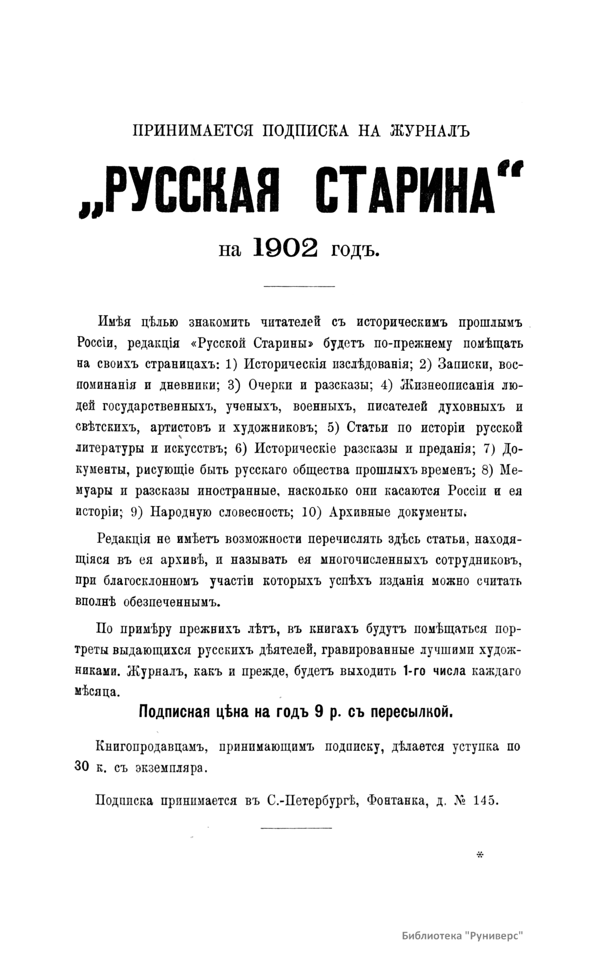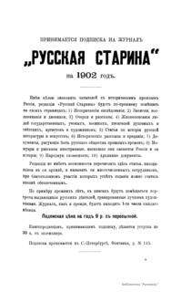 «Русская старина», ежемесячный исторический журнал, выходил в Петербурге в 1870-1918. Основан, издавался и редактировался (1870-1892) М. И. Семевским при участии В. И. Семевского. Последующими редакторами были Н. К. Шильдер (1892-1896), Н. Ф. Дубровин (1896-1904), военные историки С. П. Зыков, П. Н. Воронов.