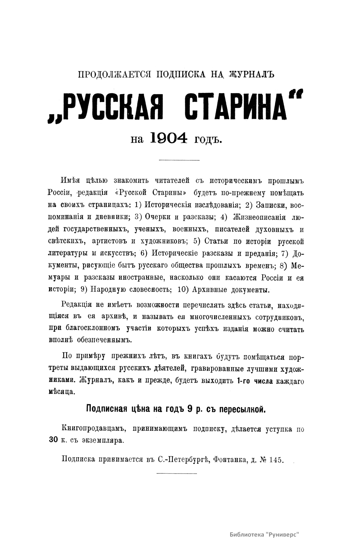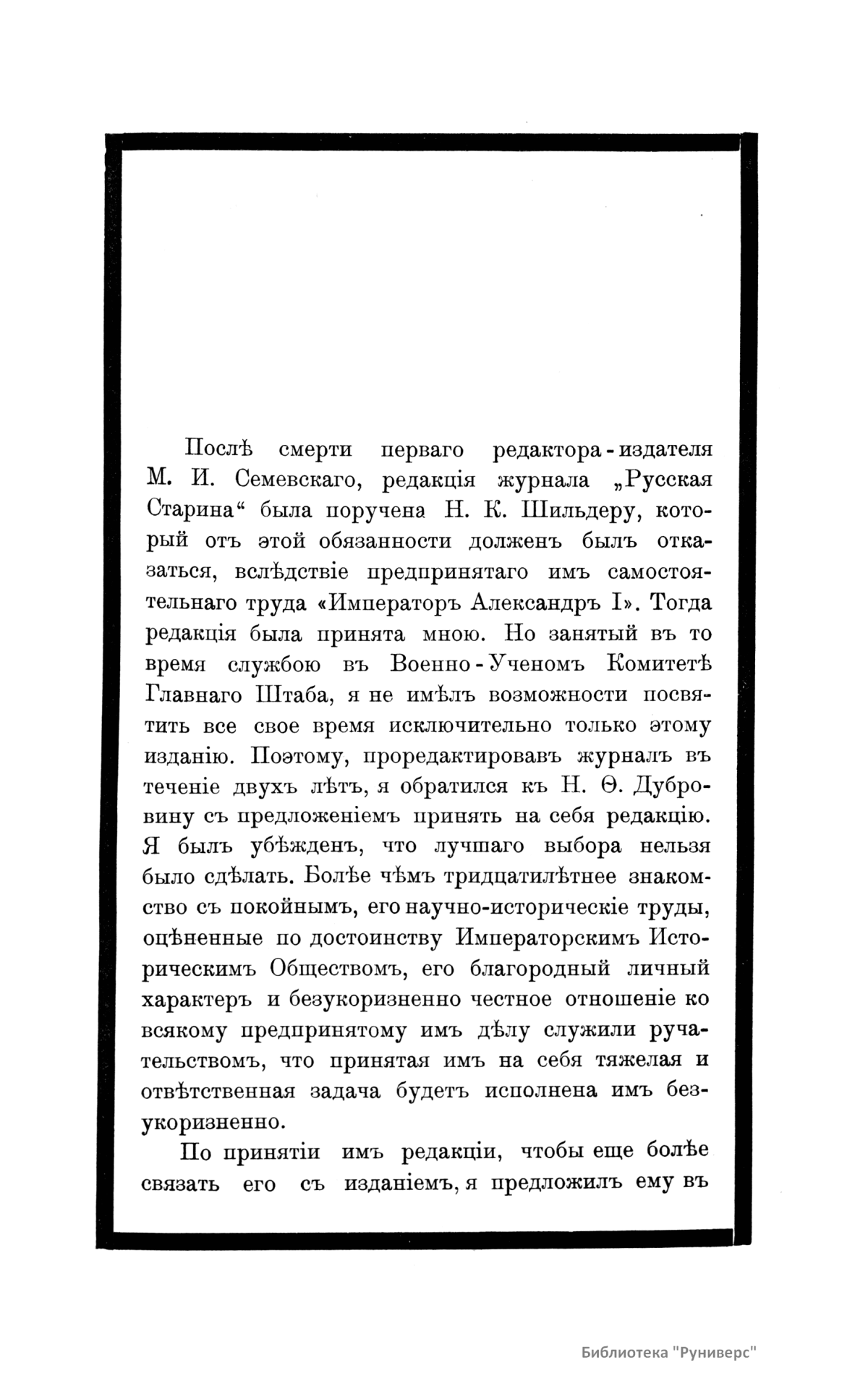 «Русская старина», ежемесячный исторический журнал, выходил в Петербурге в 1870-1918. Основан, издавался и редактировался (1870-1892) М. И. Семевским при участии В. И. Семевского. Последующими редакторами были Н. К. Шильдер (1892-1896), Н. Ф. Дубровин (1896-1904), военные историки С. П. Зыков, П. Н. Воронов.