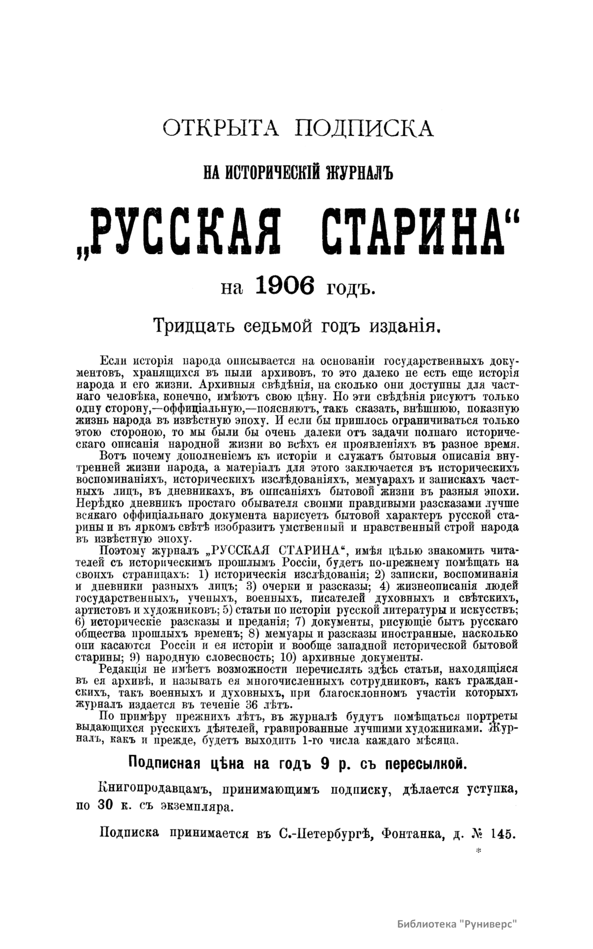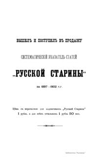 «Русская старина», ежемесячный исторический журнал, выходил в Петербурге в 1870-1918. Основан, издавался и редактировался (1870-1892) М. И. Семевским при участии В. И. Семевского. Последующими редакторами были Н. К. Шильдер (1892-1896), Н. Ф. Дубровин (1896-1904), военные историки С. П. Зыков, П. Н. Воронов.