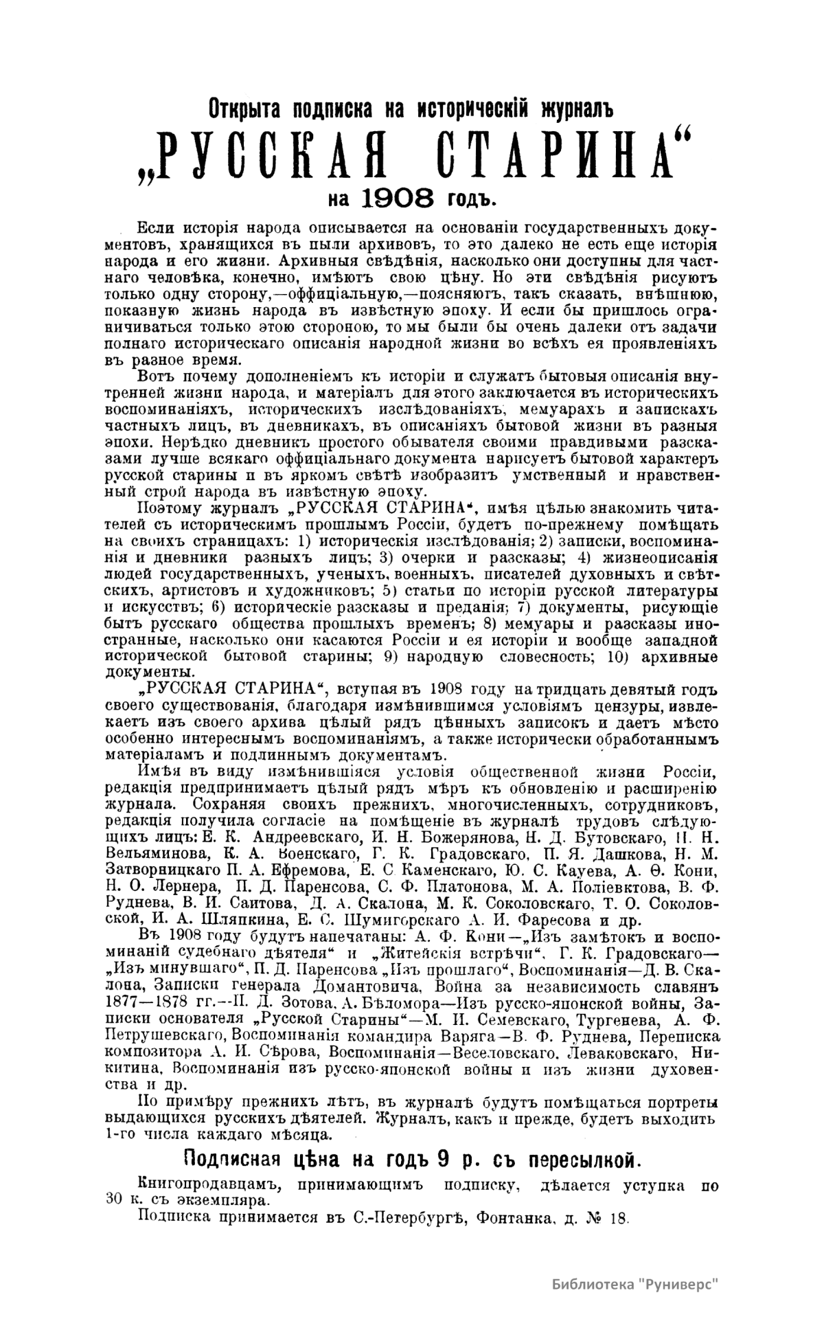 На страницах «Русской старины» напечатаны думы, послания, эпиграммы К. Ф. Рылеева, басни И. А. Крылова, И. И. Хемницера, Измайлова, стихотворения графа А. К. Толстого, К. Р., Я. Б. Княжнина, А. Н. Нахимова, К. П. Батюшкова, барона Дельвига, Розенгейма, В. А. Жуковского, М. Ю. Лермонтова, А. И. Одоевского, Кюхельбекера, Баратынского, вновь найденные строфы из «Евгения Онегина» и отрывки из «Мертвых душ», а также автобиографии и переписки писателей, под редакцией П. А. Ефремова. Статьи и исследования по вопросам новейшей русской истории принадлежат самому М. И. Семевскому, В. А. Бильбасову, А. П. Брикнеру, князю Н. С. Голицыну, Д. И. Иловайскому, П. И. Карцову, барону Н. А. Корфу, Н. И. Костомарову, И. И. Ореусу, А. Н. Петрову, В. И. Семевскому, Н. К. Шильдеру и др.К журналу выпущены отдельные издания: Указатель «Русская старина».СПб, 1883 г . (1 том), «Систематическая роспись содержания «Русской старины» за 1870-1884 гг.» (СПб., 1885), и четыре прибавления: за 1885-1887 гг. (СПб., 1888), за 1888-1890 гг. (СПб., 1891), за 1891-1896 гг. (СПб., 1897), за 1896-1902 гг. (СПб., 1903) (5 изданий в 3-х томах), сборник гравюр «Русские деятели в портретах изданных редакциею исторического журнала «Русская старина». СПб, 1886-1891 гг.(5 изданий, 2 тома).