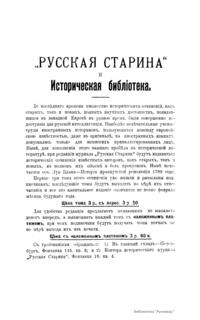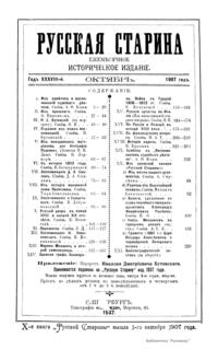 «Русская старина», ежемесячный исторический журнал, выходил в Петербурге в 1870-1918. Основан, издавался и редактировался (1870-1892) М. И. Семевским при участии В. И. Семевского. Последующими редакторами были Н. К. Шильдер (1892-1896), Н. Ф. Дубровин (1896-1904), военные историки С. П. Зыков, П. Н. Воронов.