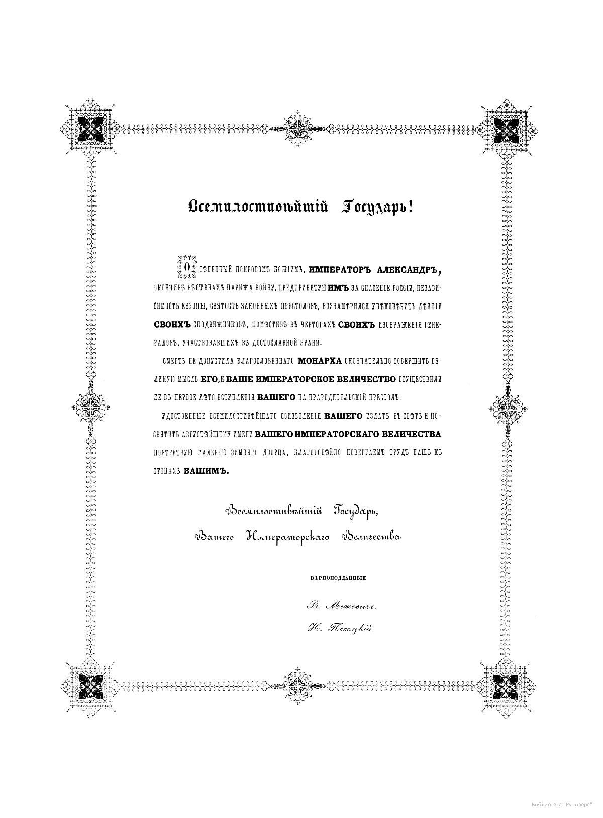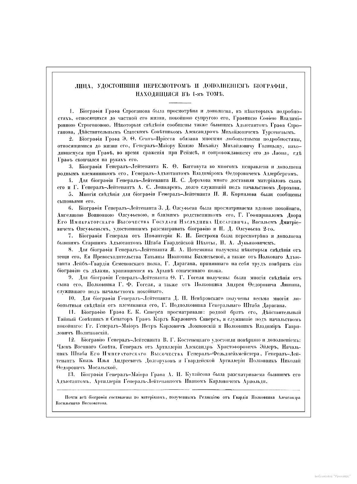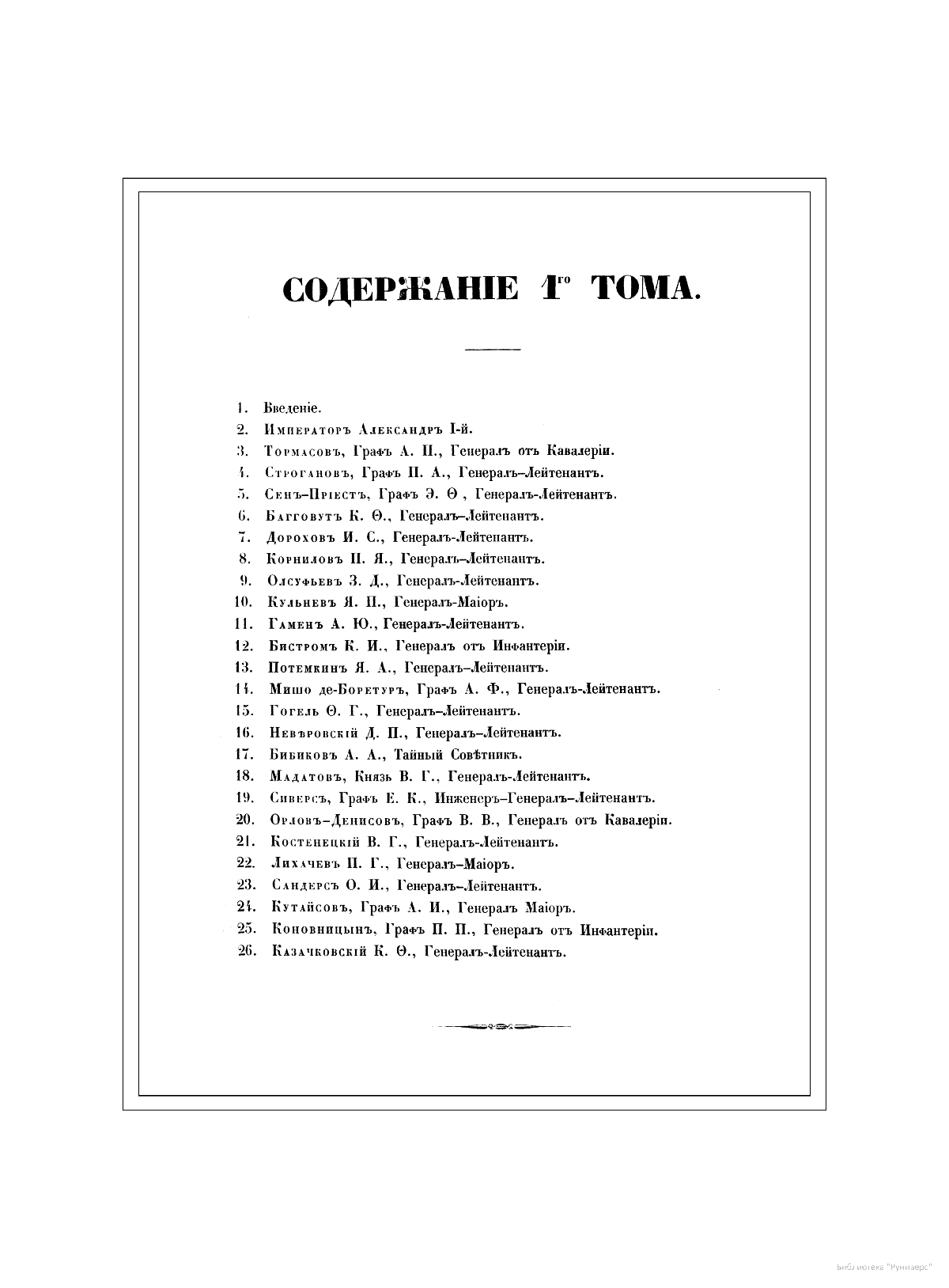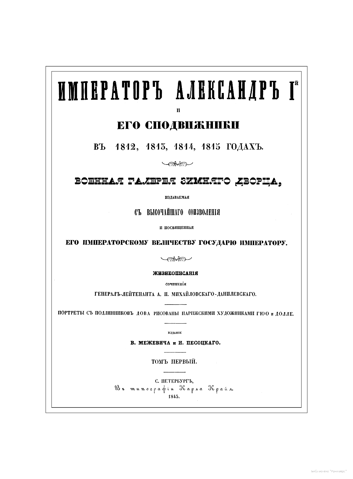 Александр Иванович Михайловский-Данилевский (1790–1848) — участник Отечественной войны 1812 г., генерал-лейтенант, военный историк и академик Санкт-Петербургской академии наук. Автор многих трудов по истории войн Российской империи. В последние годы своей жизни А. И. Михайловский-Данилевский был главным редактором «Военной галереи Зимнего дворца». Война 1812 г. получила название Отечественной и стала ярчайшей страницей российской истории и культуры. В Зимнем дворце столицы император Александр I повелел создать Военную галерею 1812 г. Ни в одном из дворцов Европы не существовало портретной галереи подобной той, что должна была украсить парадную резиденцию русских императоров. В Военной галерее Зимнего дворца должны были разместиться более 300 портретов, для исполнения которых в Петербург весной 1819 г. приехал известный английский живописец Джордж Доу (Даву). В создании портретной галереи принимали участие и русские художники — В. А. Голике, А. В. Поляков. Торжественное открытие галереи состоялось уже в царствование Николая I, в годовщину изгнания французов из России, 25 декабря 1826 г. Шеститомное издание «Император Александр I и его сподвижники в 1812, 1813, 1814 и 1815 гг.: Военная галерея Зимнего дворца, издаваемая с высочайшего соизволения» выходило на протяжении 1845–1849 гг. в петербургской типографии Карла Крайя. Издание объединило портреты и биографии российских генералов, участвовавших в Отечественной войне и заграничных походах. Главным редактором, а также составителем многих биографий стал А. И. Михайловский-Данилевский. Портреты с живописных оригиналов были гравированы на стали парижскими художниками Гюо и Долле. На страницах издания почетное место отведено императору Александру I, представлены биографии и портреты М. И. Кутузова, М. Б. Барклая-де-Толли, вел. кн. Константина Павловича, А. А. Аракчеева, П. П. Коновницына, Д. П. Немировского, Д. С. Дохтурова, П. И. Багратиона, Н. Н. Раевского, А. П. Ермолова, М. И. Платова и многих других героев. Труд А. И. Михайловского-Данилевского содержит обширный документальный и мемуарный материал, представляет подробное описание и анализ военных действий России и Франции на протяжении Отечественной войны 1812 г.