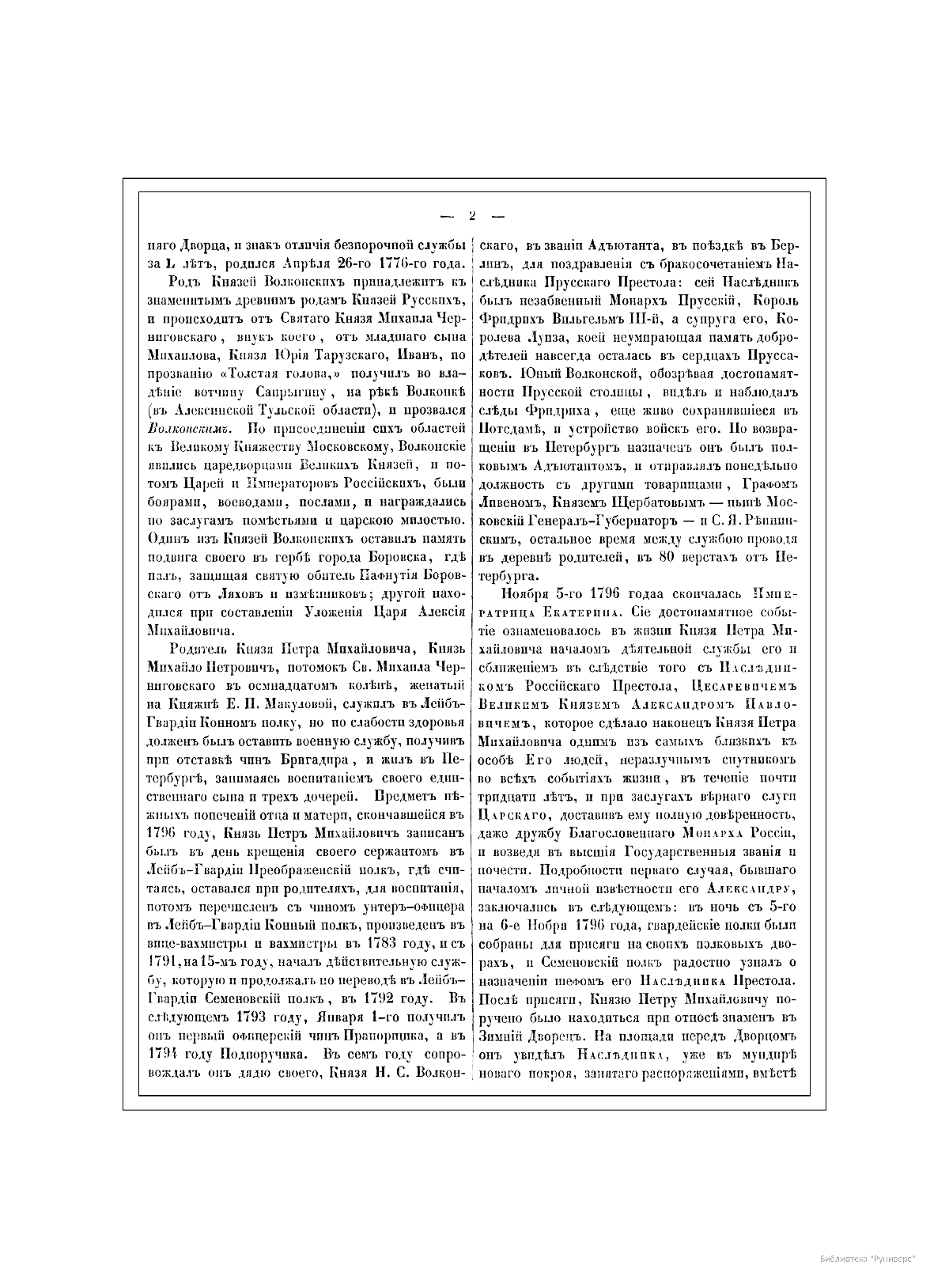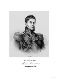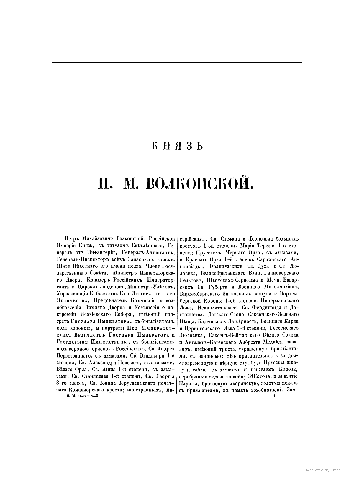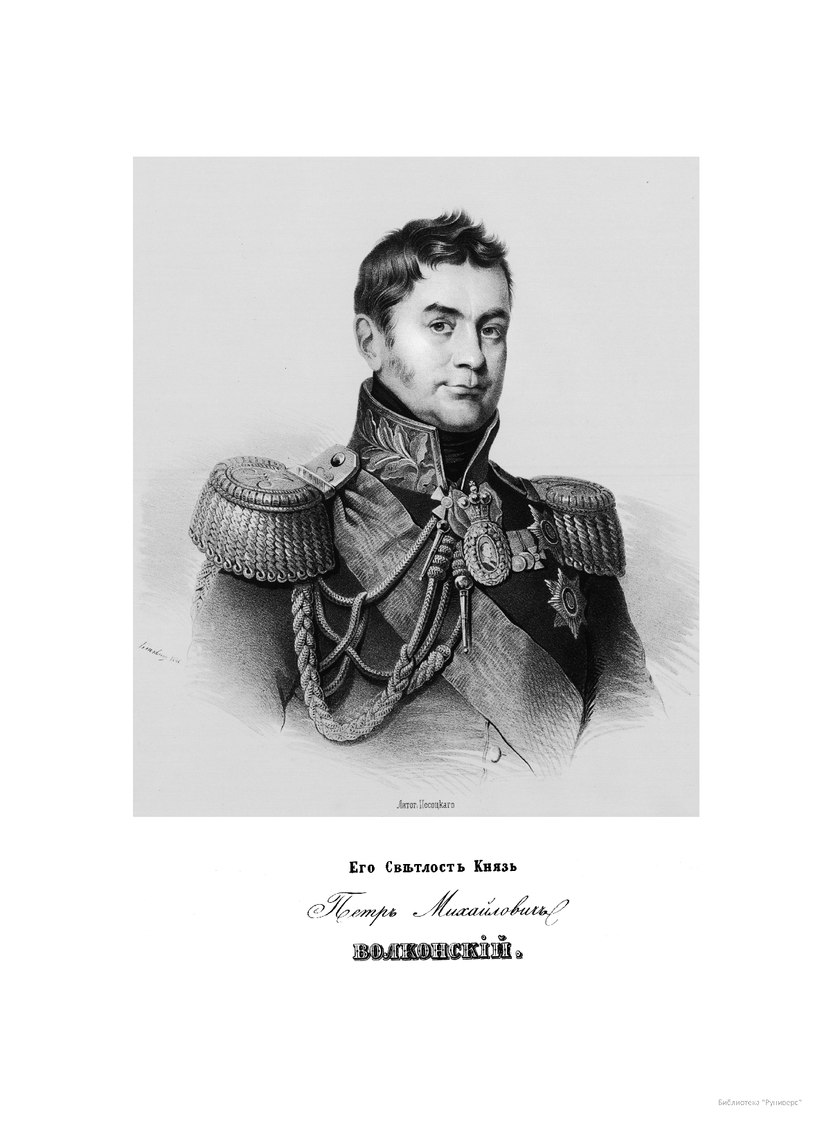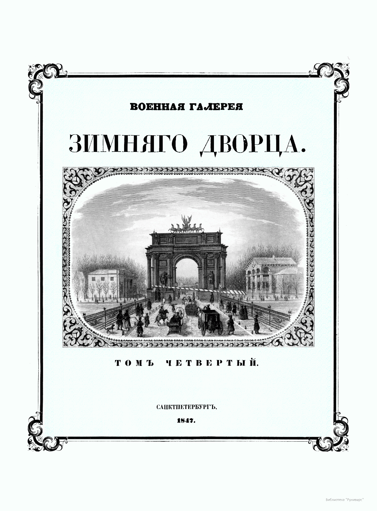 Александр Иванович Михайловский-Данилевский (1790–1848) — участник Отечественной войны 1812 г., генерал-лейтенант, военный историк и академик Санкт-Петербургской академии наук. Автор многих трудов по истории войн Российской империи. В последние годы своей жизни А. И. Михайловский-Данилевский был главным редактором «Военной галереи Зимнего дворца». Война 1812 г. получила название Отечественной и стала ярчайшей страницей российской истории и культуры. В Зимнем дворце столицы император Александр I повелел создать Военную галерею 1812 г. Ни в одном из дворцов Европы не существовало портретной галереи подобной той, что должна была украсить парадную резиденцию русских императоров. В Военной галерее Зимнего дворца должны были разместиться более 300 портретов, для исполнения которых в Петербург весной 1819 г. приехал известный английский живописец Джордж Доу (Даву). В создании портретной галереи принимали участие и русские художники — В. А. Голике, А. В. Поляков. Торжественное открытие галереи состоялось уже в царствование Николая I, в годовщину изгнания французов из России, 25 декабря 1826 г. Шеститомное издание «Император Александр I и его сподвижники в 1812, 1813, 1814 и 1815 гг.: Военная галерея Зимнего дворца, издаваемая с высочайшего соизволения» выходило на протяжении 1845–1849 гг. в петербургской типографии Карла Крайя. Издание объединило портреты и биографии российских генералов, участвовавших в Отечественной войне и заграничных походах. Главным редактором, а также составителем многих биографий стал А. И. Михайловский-Данилевский. Портреты с живописных оригиналов были гравированы на стали парижскими художниками Гюо и Долле. На страницах издания почетное место отведено императору Александру I, представлены биографии и портреты М. И. Кутузова, М. Б. Барклая-де-Толли, вел. кн. Константина Павловича, А. А. Аракчеева, П. П. Коновницына, Д. П. Немировского, Д. С. Дохтурова, П. И. Багратиона, Н. Н. Раевского, А. П. Ермолова, М. И. Платова и многих других героев. Труд А. И. Михайловского-Данилевского содержит обширный документальный и мемуарный материал, представляет подробное описание и анализ военных действий России и Франции на протяжении Отечественной войны 1812 г.