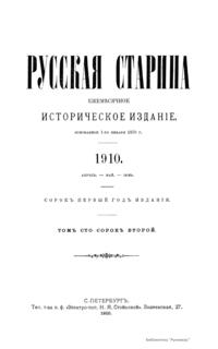 «Русская старина», ежемесячный исторический журнал, выходил в Петербурге в 1870-1918. Основан, издавался и редактировался (1870-1892) М. И. Семевским при участии В. И. Семевского. Последующими редакторами были Н. К. Шильдер (1892-1896), Н. Ф. Дубровин (1896-1904), военные историки С. П. Зыков, П. Н. Воронов.