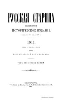 «Русская старина», ежемесячный исторический журнал, выходил в Петербурге в 1870-1918. Основан, издавался и редактировался (1870-1892) М. И. Семевским при участии В. И. Семевского. Последующими редакторами были Н. К. Шильдер (1892-1896), Н. Ф. Дубровин (1896-1904), военные историки С. П. Зыков, П. Н. Воронов.